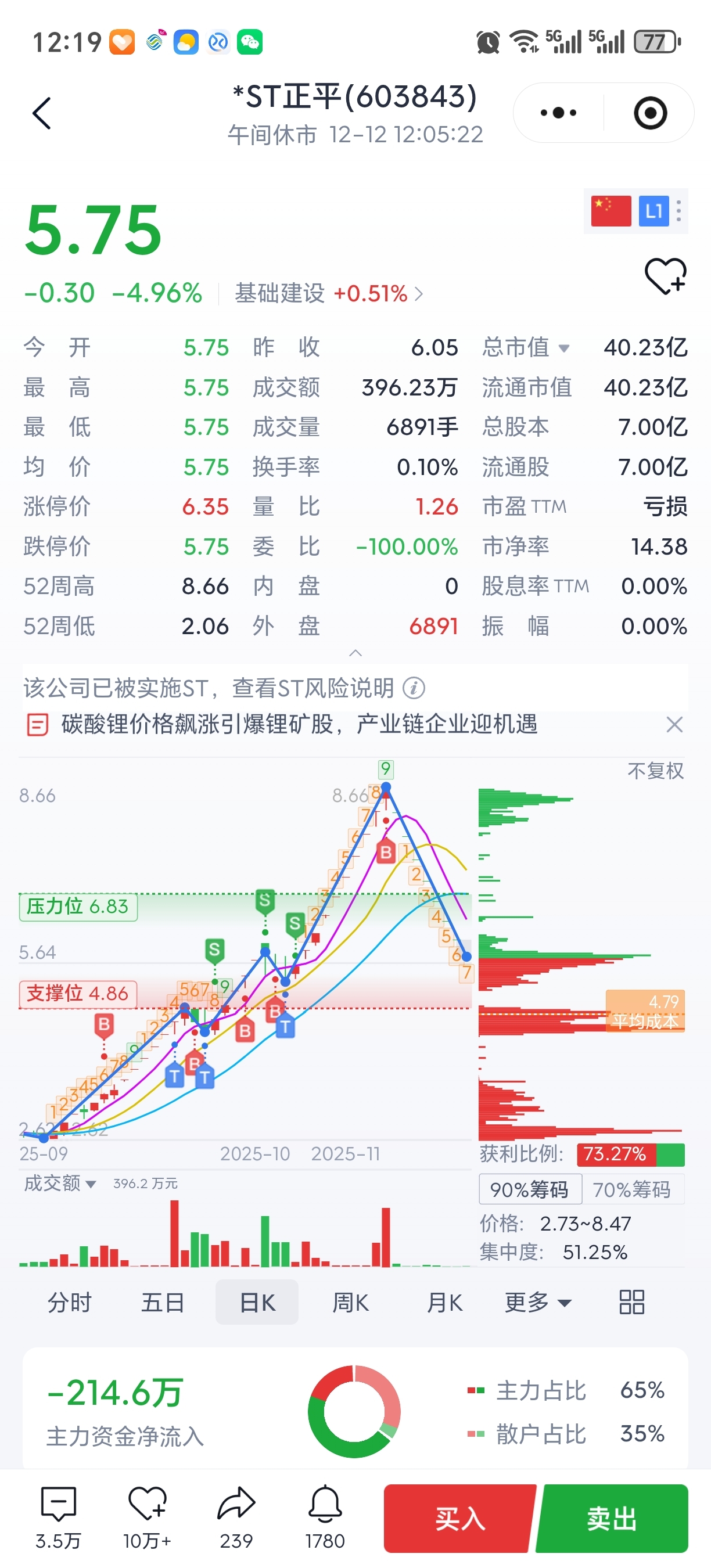 $*ST正平(SH603843)$ 最高点,山顶风好大!