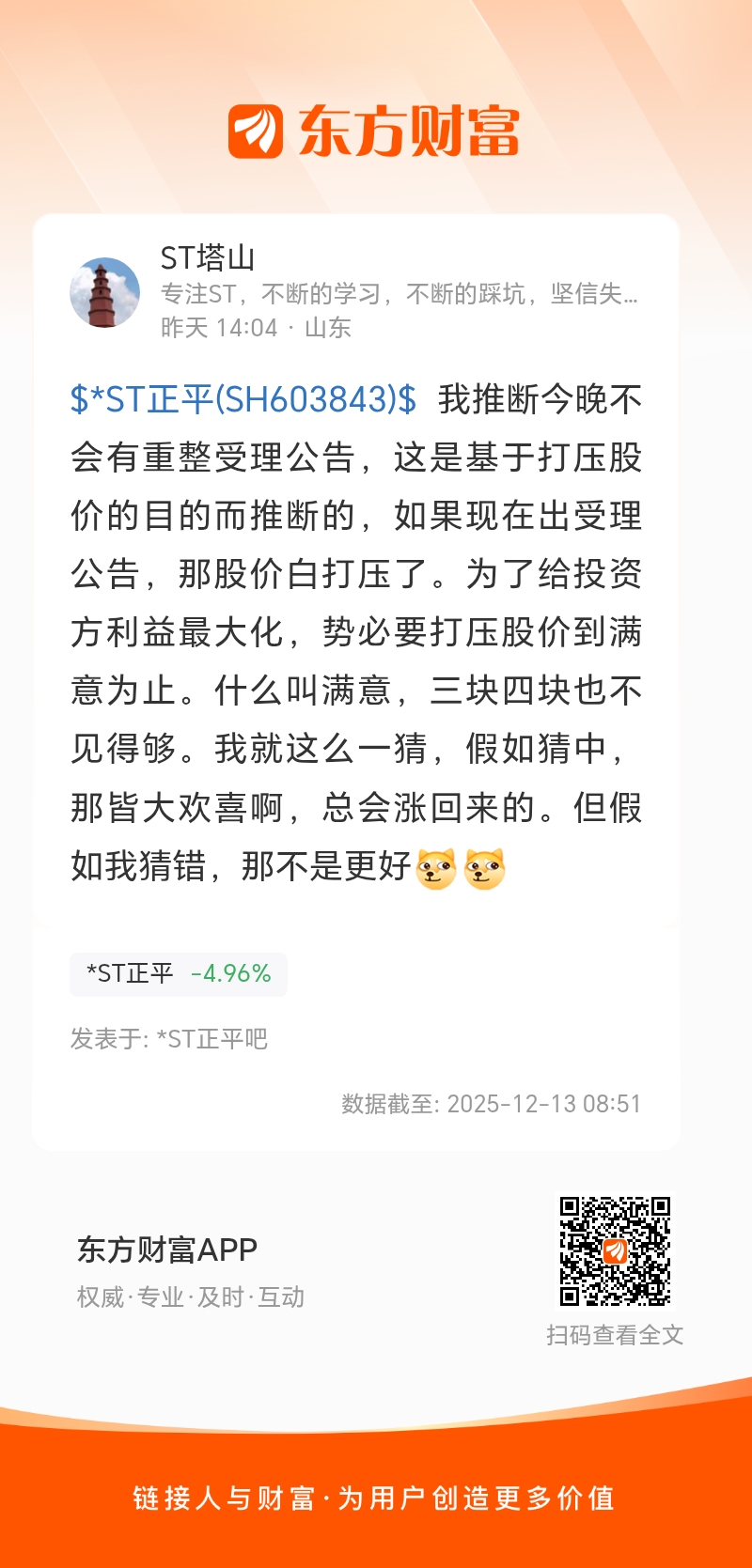 $*ST正平(SH603843)$ 我推断今晚不会有重整受理公告,这是基于打压股价的目的而推断的,如果现在出受理公告,那股价白打压了。为了给投资方利益最大化,势必要打压股价到满意为止。什么叫满意,三块四块也不见得够。我就这么一猜,假如猜中,那皆大欢喜啊,总会涨回来的。但假如我猜错,那不是更好