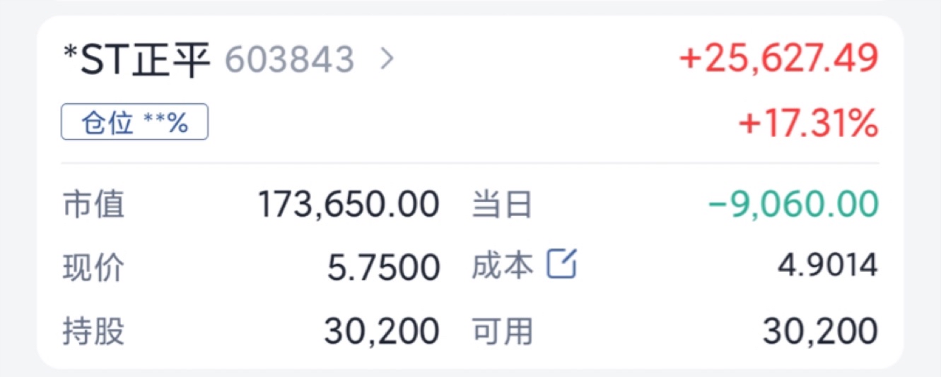 $*ST正平(SH603843)$ 新的一天,跌停也扛,记住,你恐惧的时候往往是机会来了!做股票要稳,一定是低位买。一路上涨时我不说一句话。今天一路下跌时你们恐惧时,请看看我经历过的中润和景峰,面值退市拿到现在,正平这点风浪不算啥!加油
