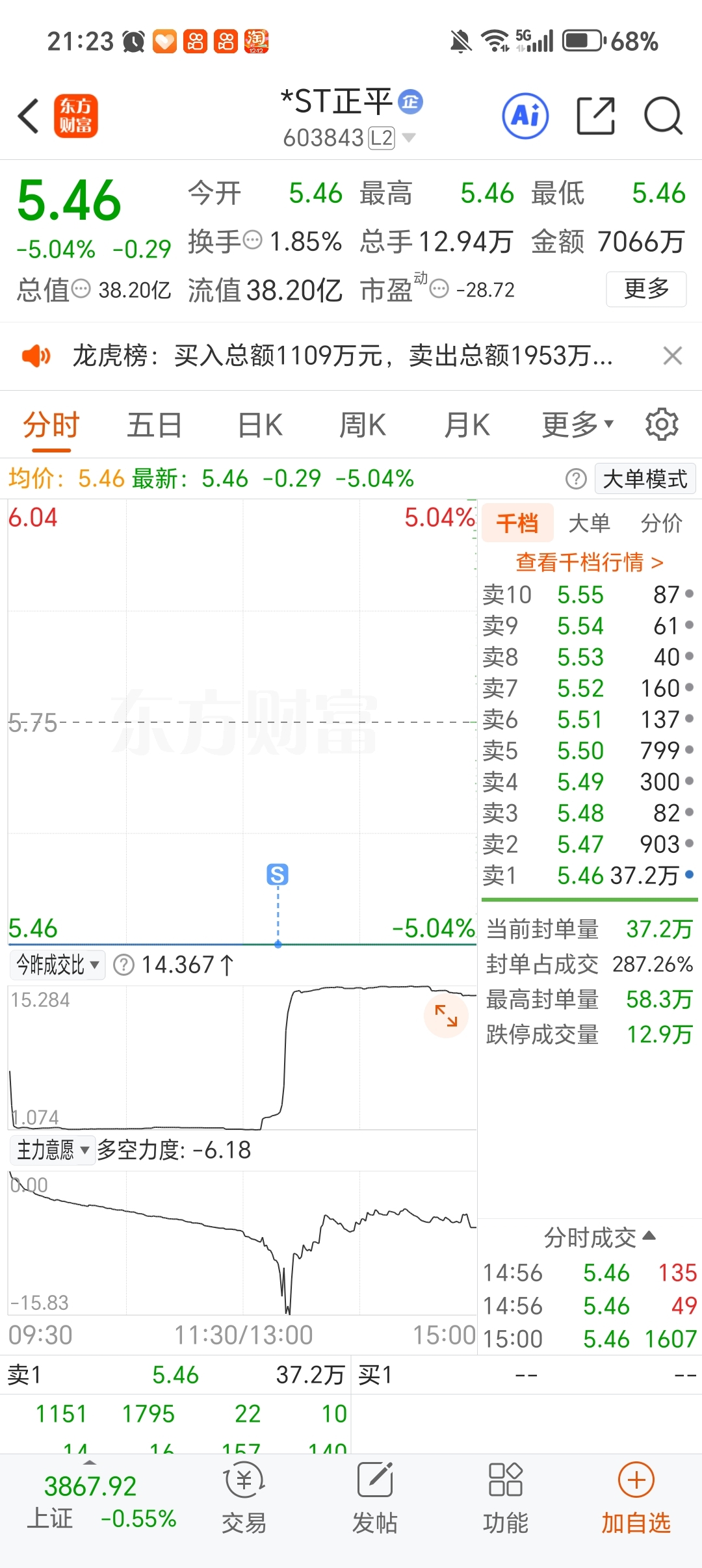 $*ST正平(SH603843)$ 已卖出删除自选!祝留下的发财。底部筹码已经跑掉一半了。a杀一字无量的没啥好留恋的,外面好股多的是。别在这里吊死,每日担惊受怕。留点钱过年,恶庄恕不奉陪