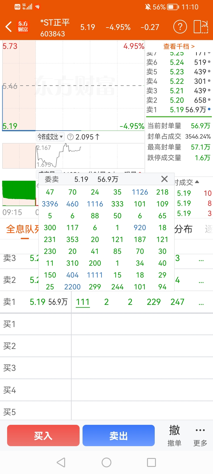 $*ST正平(SH603843)$ 正平十个一字跌停板了,今天的逐笔成交没有千手大单买入,等正平有连续单笔5000手大单买入时才能搏一搏地天板!小单撬不开板的!封单少于5万手才能博弈,现在50多万手封单谁敢买呢?