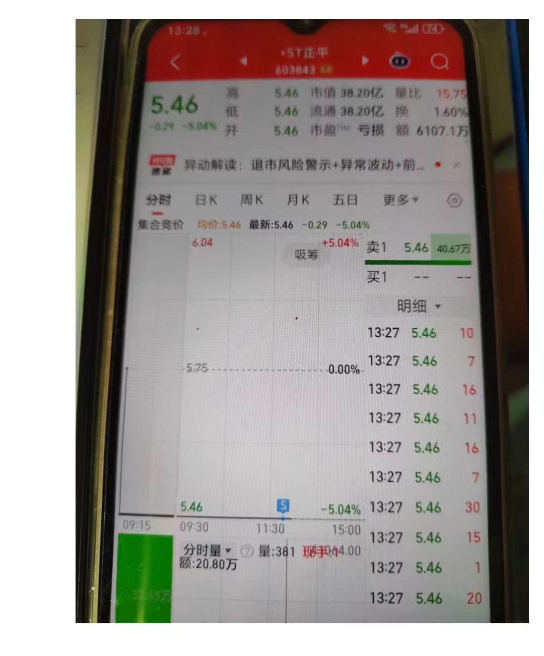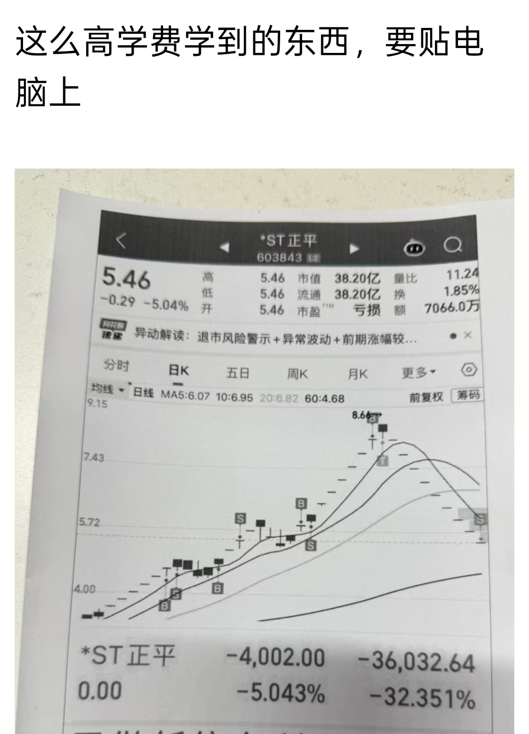 $*ST正平(SH603843)$ 周五没有卡点挂隔夜单,后悔死。我居然天真的想他自然开板再出来。我看了几个职业st玩家,他们周五全部卡点挂单的全跑出来了,哎,从今天开始订好闹钟,天天挂,一刻也不能懈怠了。