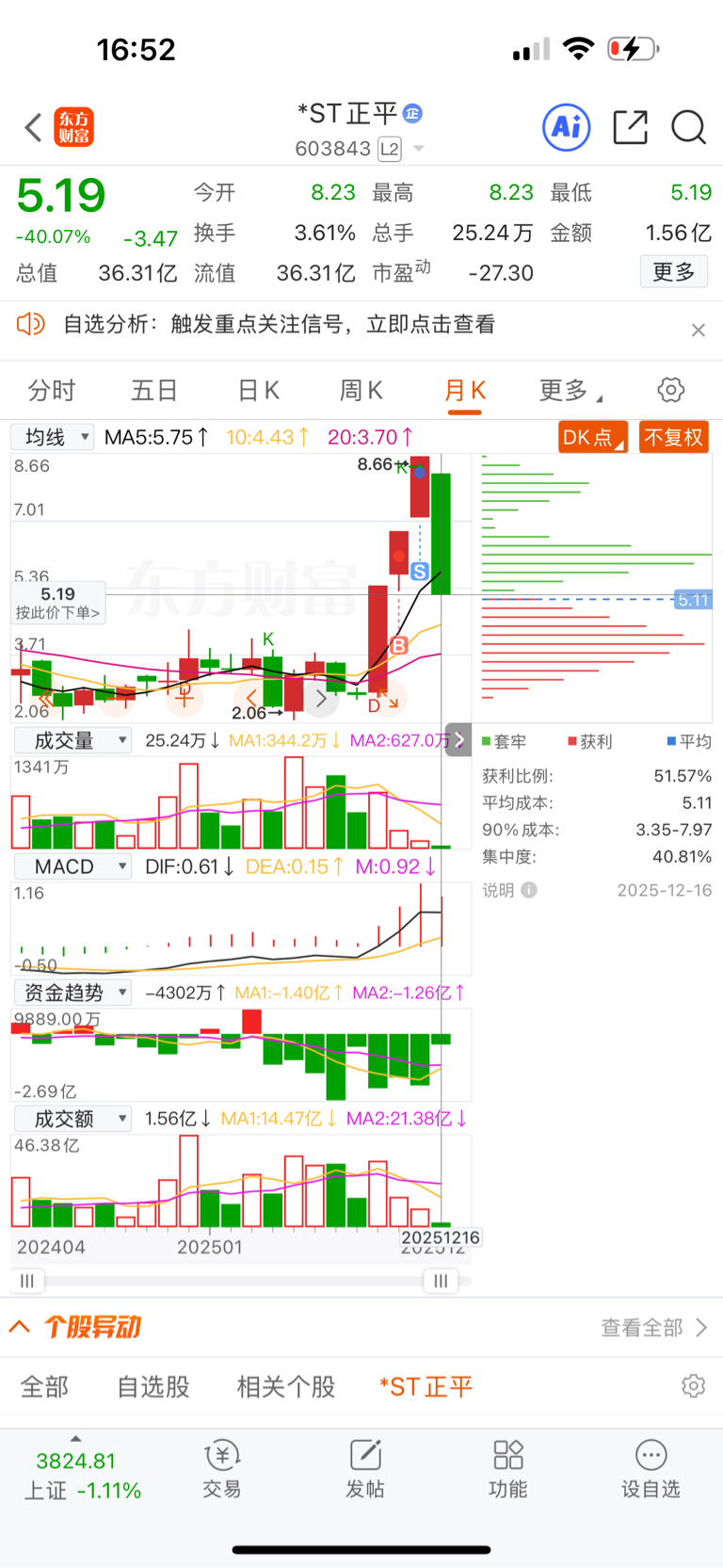 $*ST正平(SH603843)$ 这还那么多获利盘。什么时候是头啊