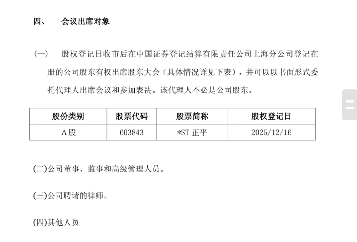 $*ST正平(SH603843)$ 我突然发现一件事,不知当讲不当讲,12月25号的股东大会,股权登记日在12.16号今天,那么,明天是否会迎来反转?第二就是,如果到时候是不是会有转赠股本的说法,会不会走st中捷的老路,转赠中小股东,毕竟压的这么深会不会有什么说法?