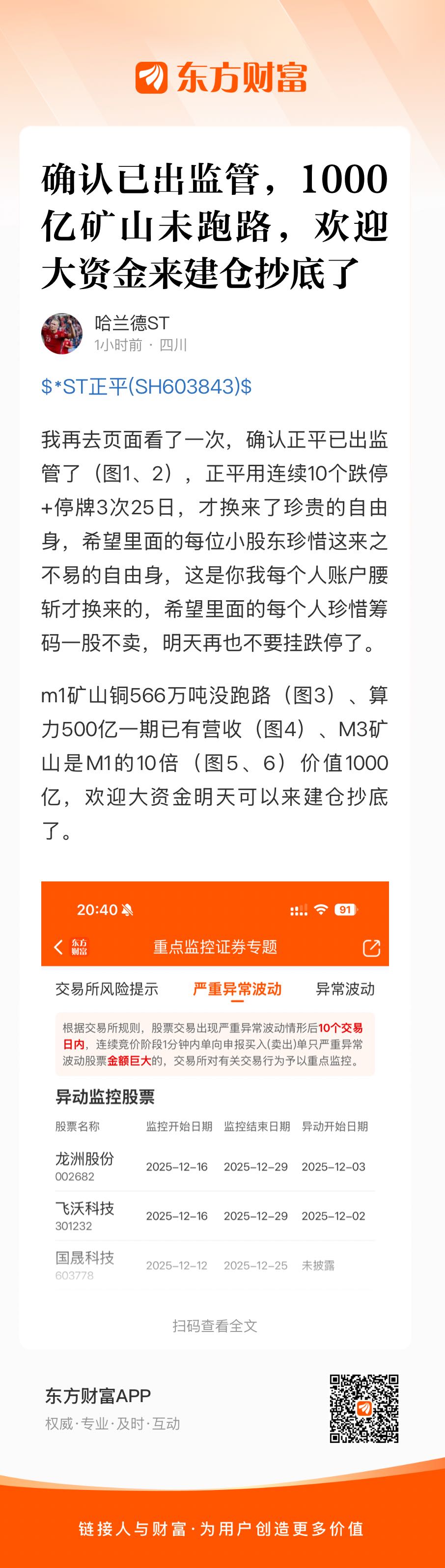我再去页面看了一次,确认正平已出监管了(图1、2),正平用连续10个跌停+停牌3次25日,才换来了珍贵的自由身,希望里面的每位小股东珍惜这来之不易的自由身,这是你我每个人账户腰斩才换来的,希望里面的每个人珍惜筹码一股不卖,明天再也不要挂跌停了。