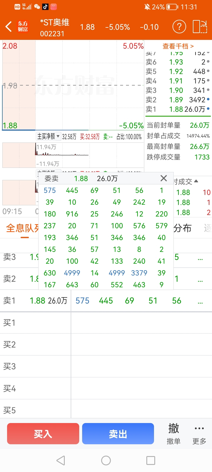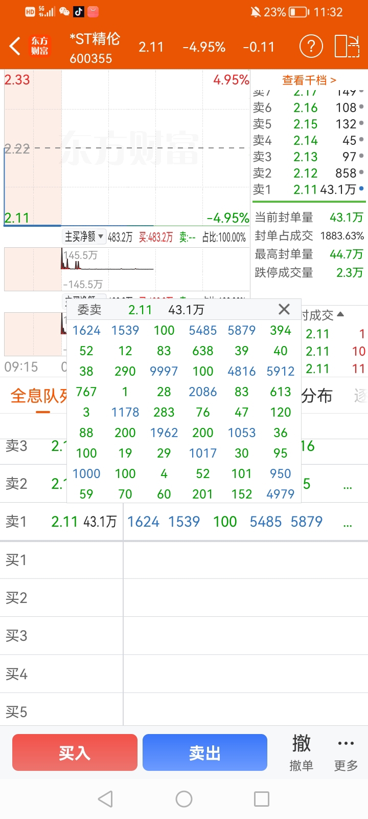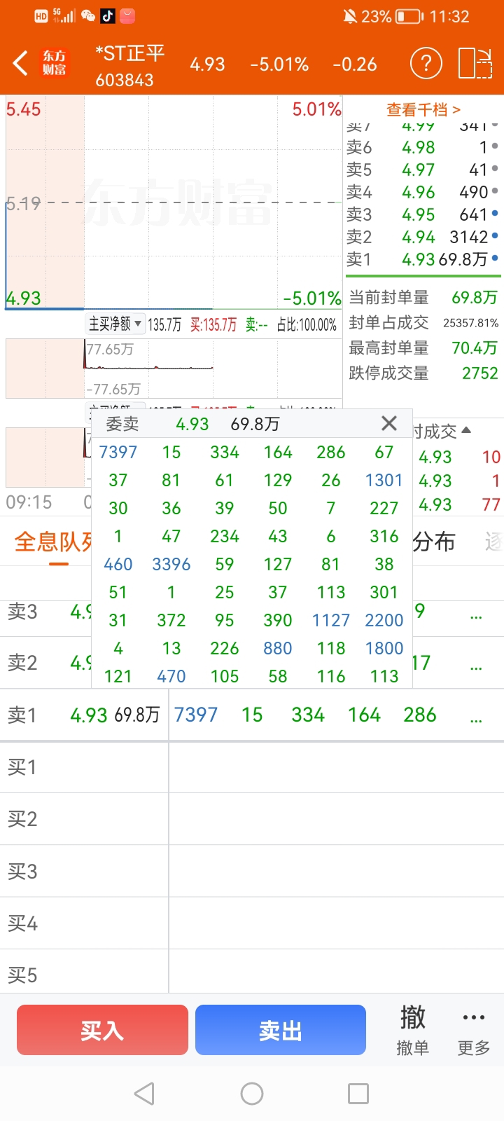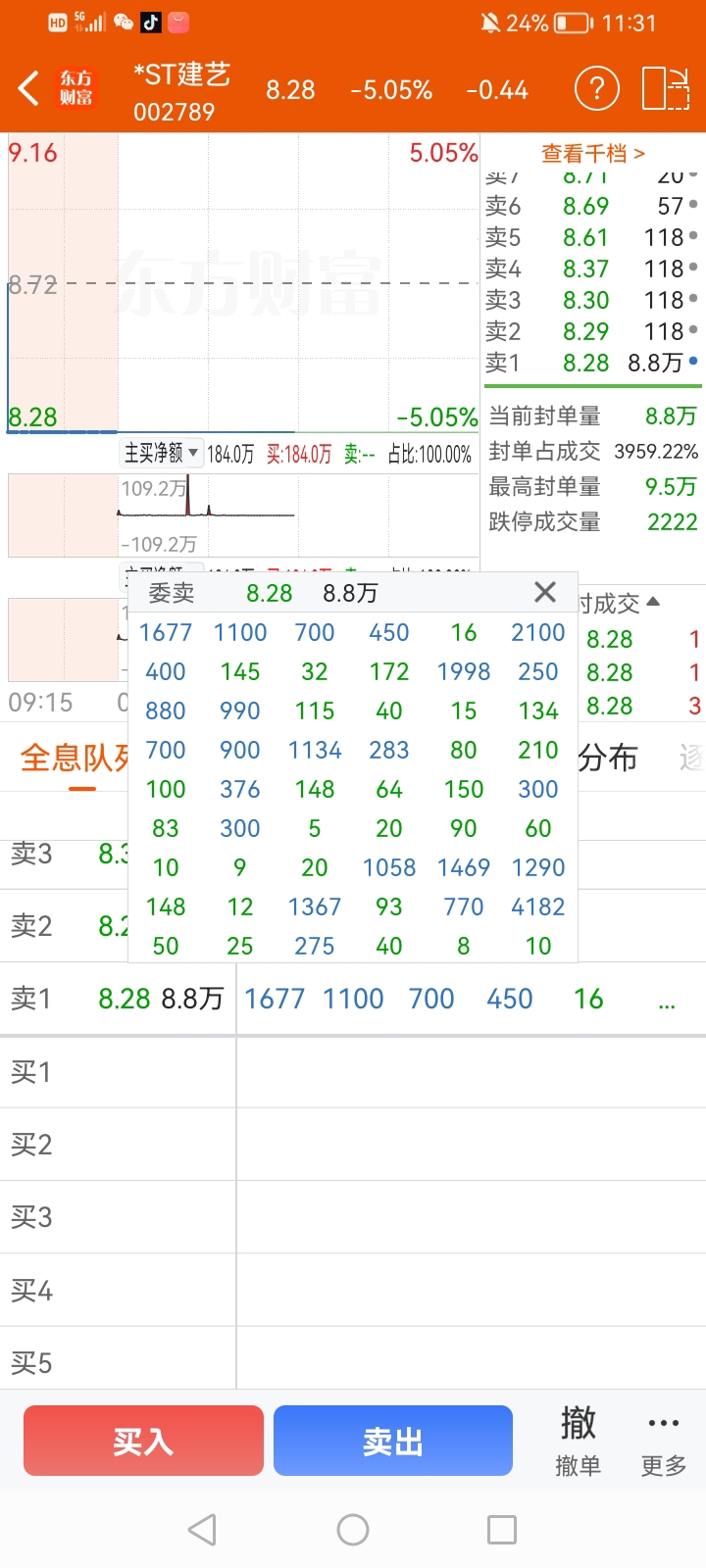 $*ST正平(SH603843)$ $*ST精伦(SH600355)$ $*ST奥维(SZ002231)$ $*ST建艺(SZ002789)$ 没排在第一页的可以撤单了!排后面都出不去还压盘导致越来越恐慌,压盘越来越多导致没人敢撬板!