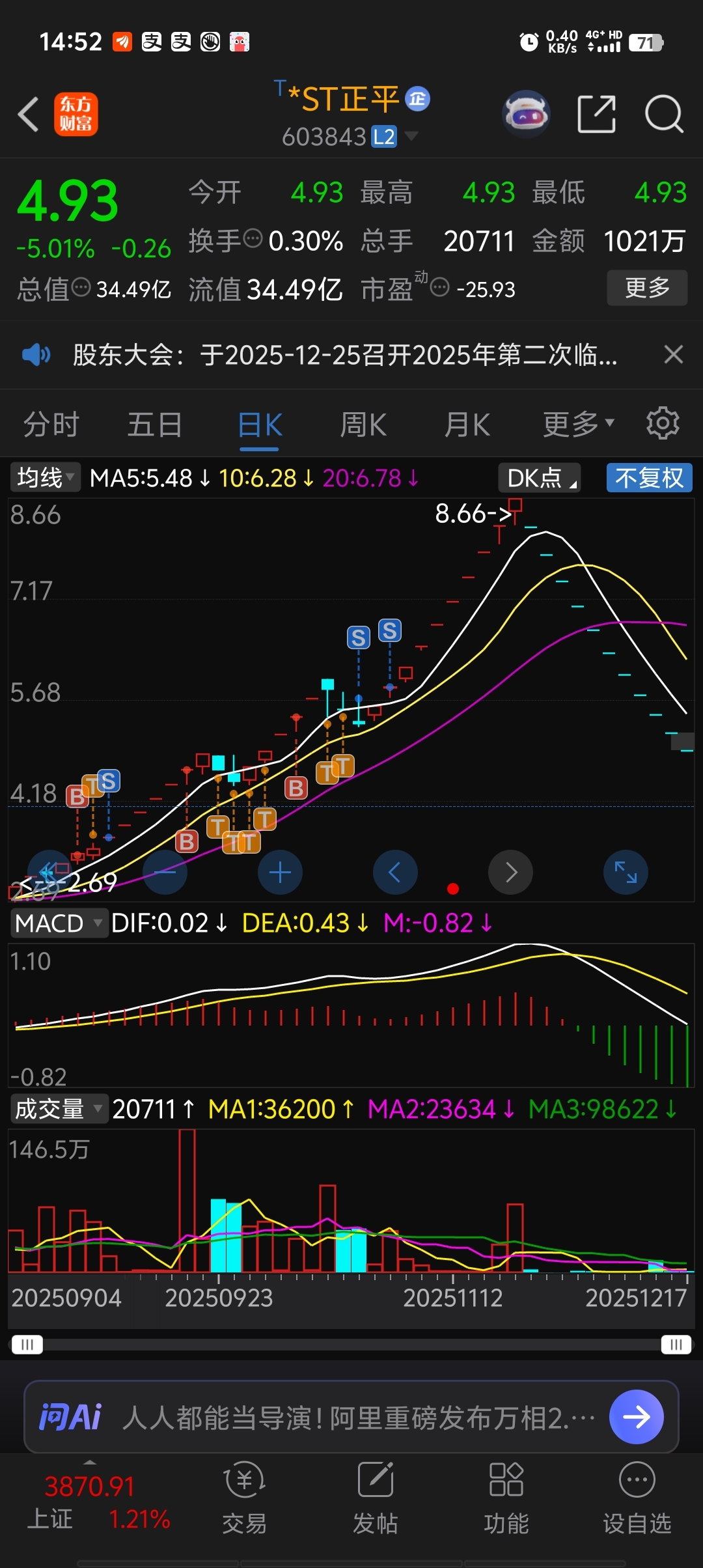 $*ST正平(SH603843)$ 从翻一倍到利润只剩20个点了,实在是扛不住了,以后11月份就要退出st板块了。不要看底牌,不要去赌,见好就收 ,正平,东易 这波教会我们一定一定要时时刻刻敬畏市场。