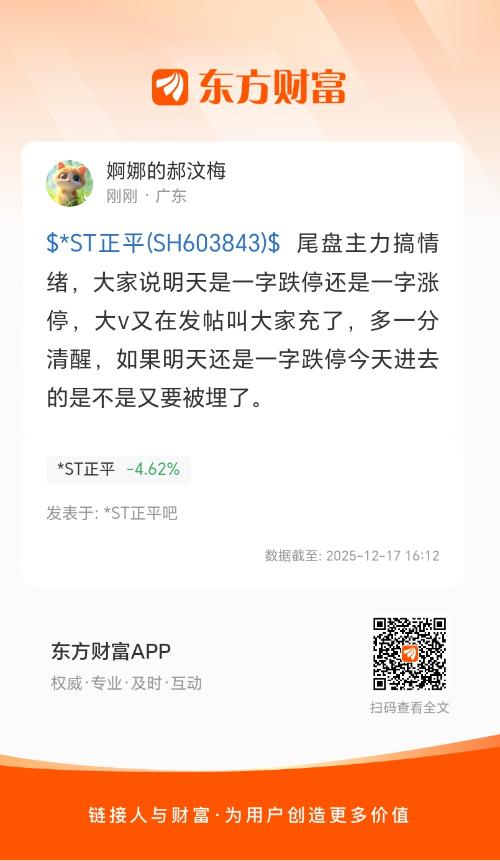 $*ST正平(SH603843)$ 尾盘主力搞情绪,大家说明天是一字跌停还是一字涨停,大v又在发帖叫大家充了,多一分清醒,如果明天还是一字跌停今天进去的是不是又要被埋了。