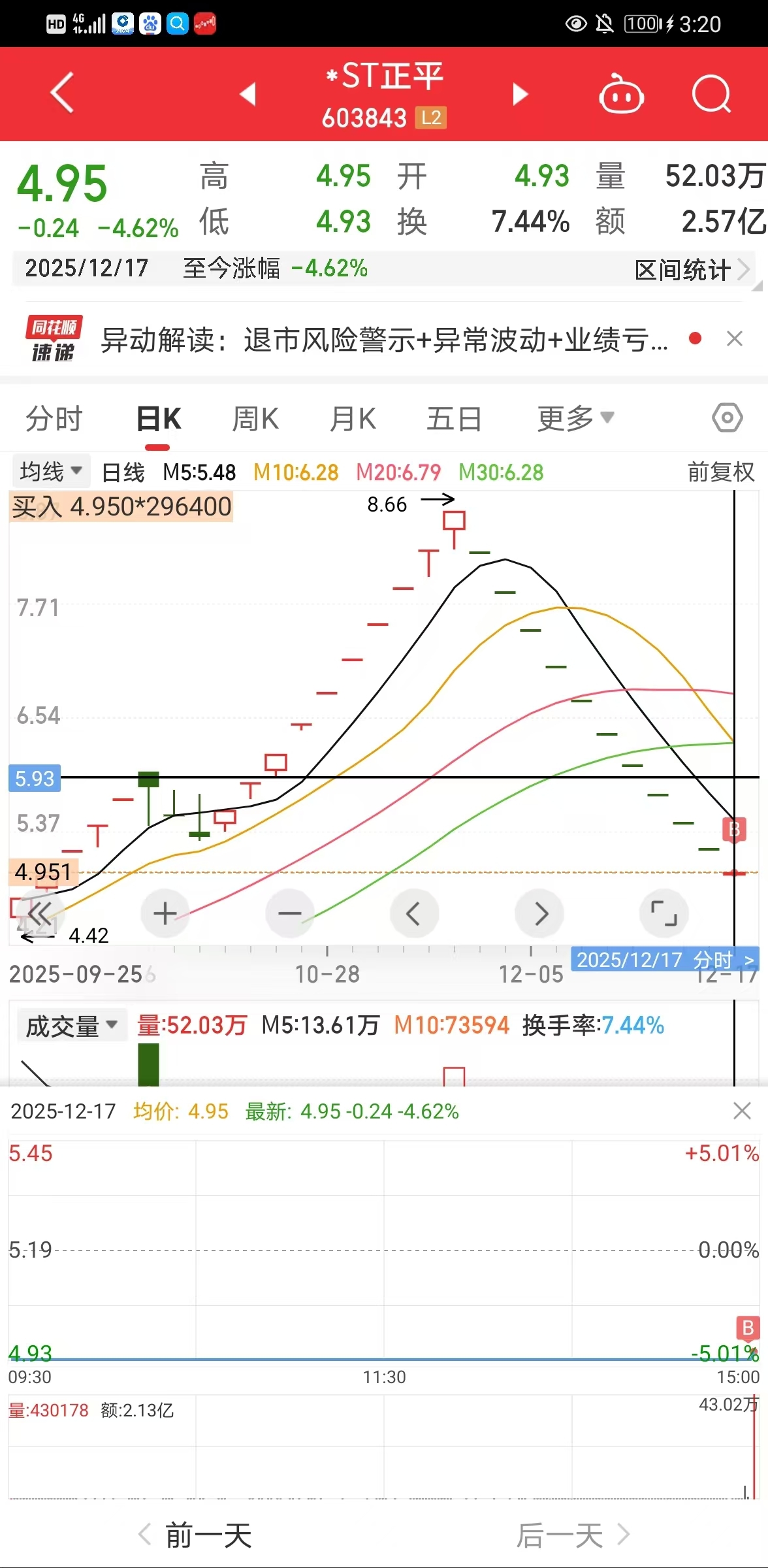 $*ST正平(SH603843)$ 两个账户买了三百个,预期是两到三个一字涨停板。