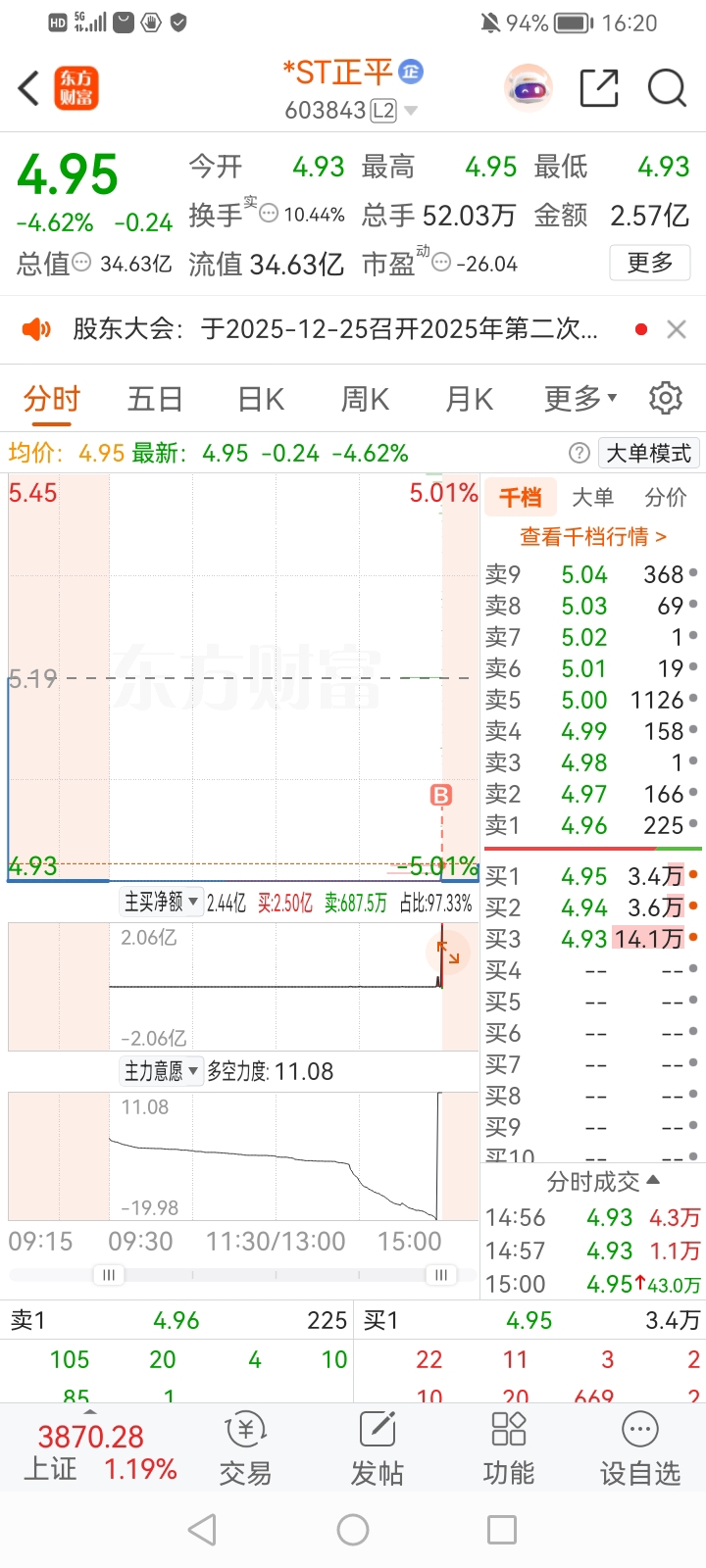 $*ST正平(SH603843)$ 尾盘集合竞价翘板绝对不可能是出货,尾盘集合竞价才3分钟能吸引多少散户买入?主力尾盘集合竞价搞偷袭就是为了甩掉大量跟风抄底的散户!因为如果主力盘中翘板的话一定会吸引来大量抄底的散户那样主力吃不到更多筹码!所以只能尾盘集合竞价搞偷袭甩掉大量撬板的跟风盘!明天正平必高开秒板!