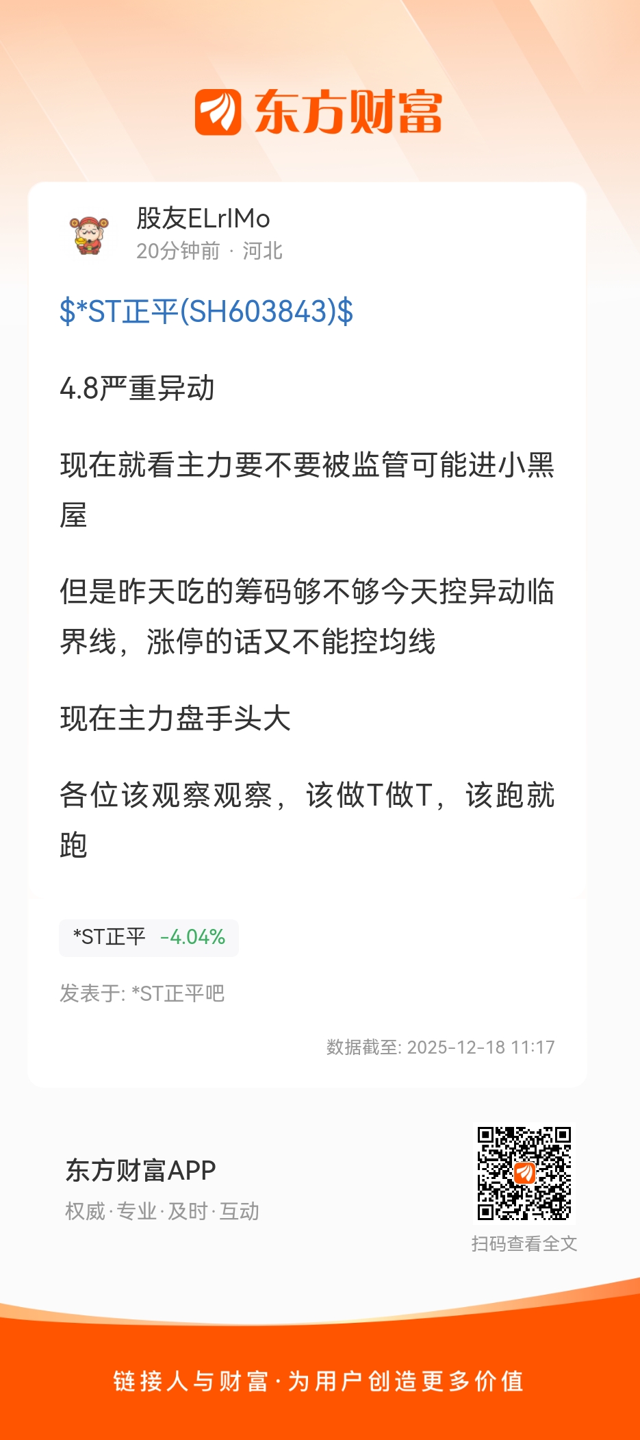 温馨提示: 1.根据《证券法》规定,禁止编造、传播虚假信息或者误导性信息,扰乱证券市场;2.用户在本社区发表的所有资料、言论等仅代表个人观点,与本网站立场无关,不对您构成任何投资建议。用户应基于自己的独立判断,自行决定证券投资并承担相应风险。《东方财富社区管理规定》