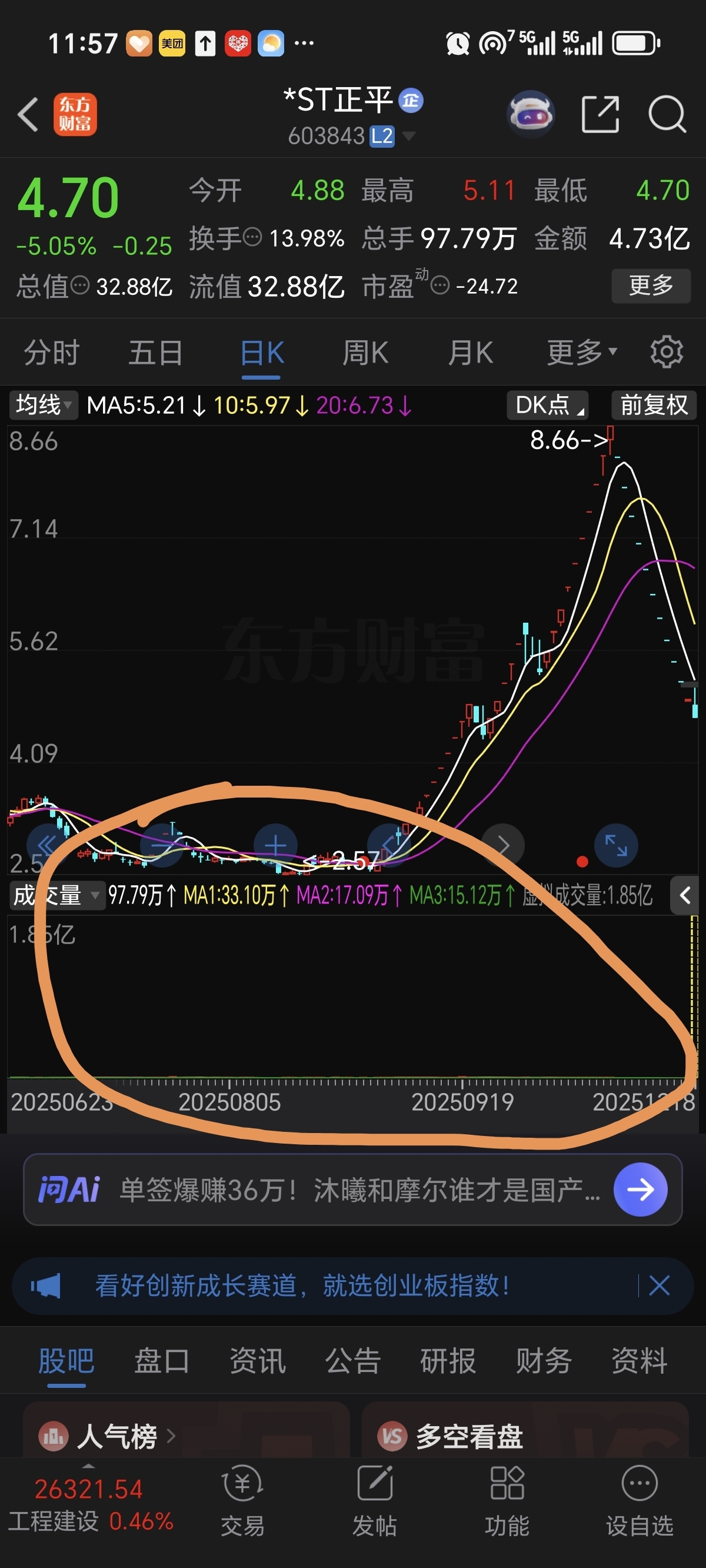 $*ST正平(SH603843)$ 有没有大哥知道咋回事,东方财富日成交量柱怎么不显示了??