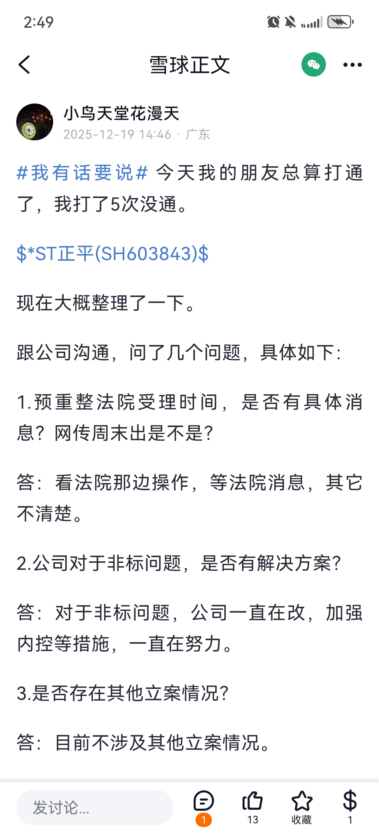 $*ST正平(SH603843)$ 大家都在努力,都在打电话,你们这一群巨婴!天天想做短线,骗来骗去!自己一个电话不打!也不想努力!卖了就别买了,外面涨的那么好!气死我了!