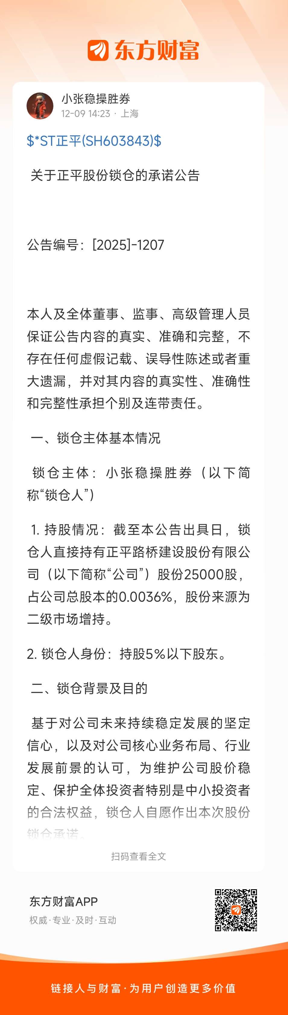 1. 持股情况:截至本公告出具日,锁仓人直接持有正平路桥建设股份有限公司(以下简称“公司”)股份25000股,占公司总股本的0.0036%,股份来源为二级市场增持。