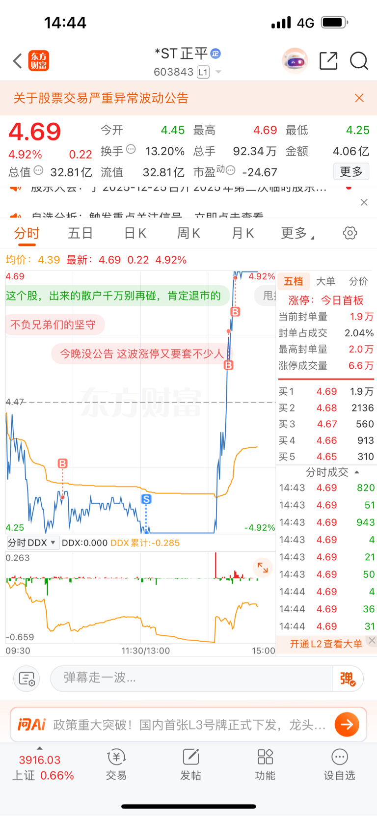 $*ST正平(SH603843)$ 底盘出了,去加东易了,后面又加进来了,希望今晚出大利好公告吧