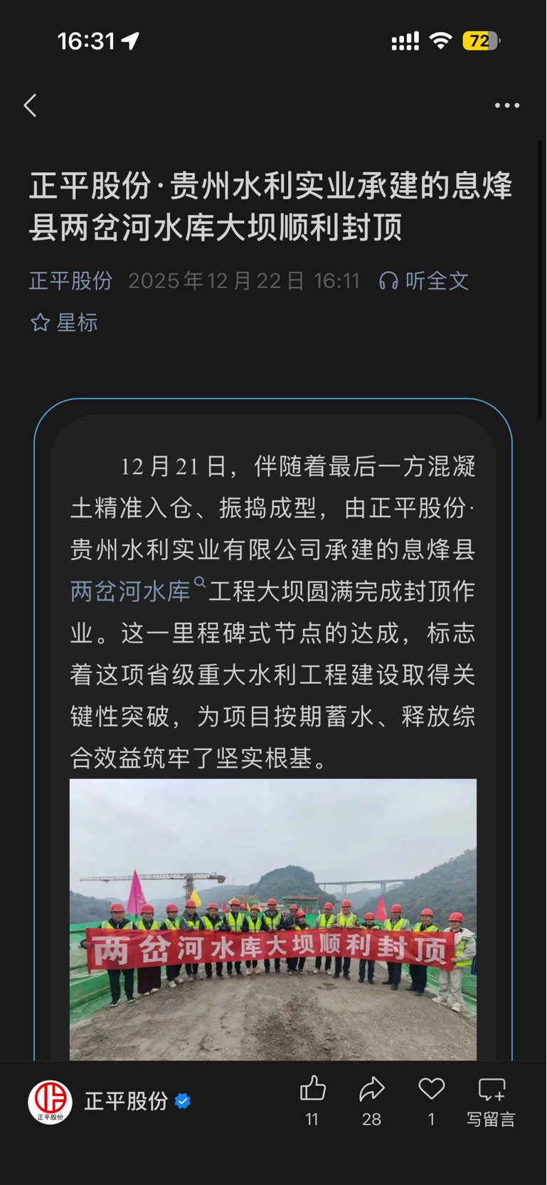 $*ST正平(SH603843)$ 双喜临门!能赶在年前封顶,今年年底正好验收,大坝前期垫的资金回笼,明年再收到尾款!扭亏为盈之势不可逆转!从今天开始我不做T了,一股不卖!
