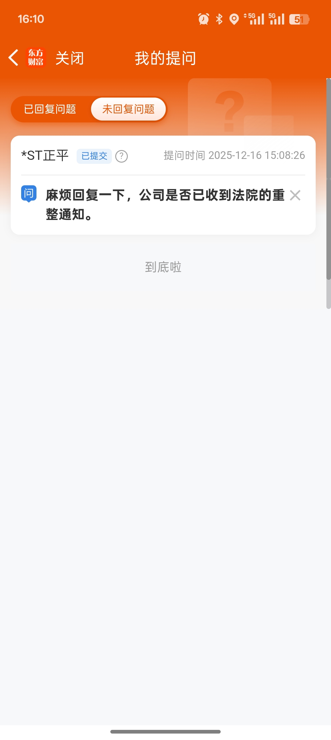 $*ST正平(SH603843)$ 董秘为什么不回复?按规定法院在收到债权人申请破产重整,法院5天内需通知债务人,也就是正平股份,公司没收到通知?受不受理是一回事,我想知道的是公司收到通知没有,为什么不发公告!