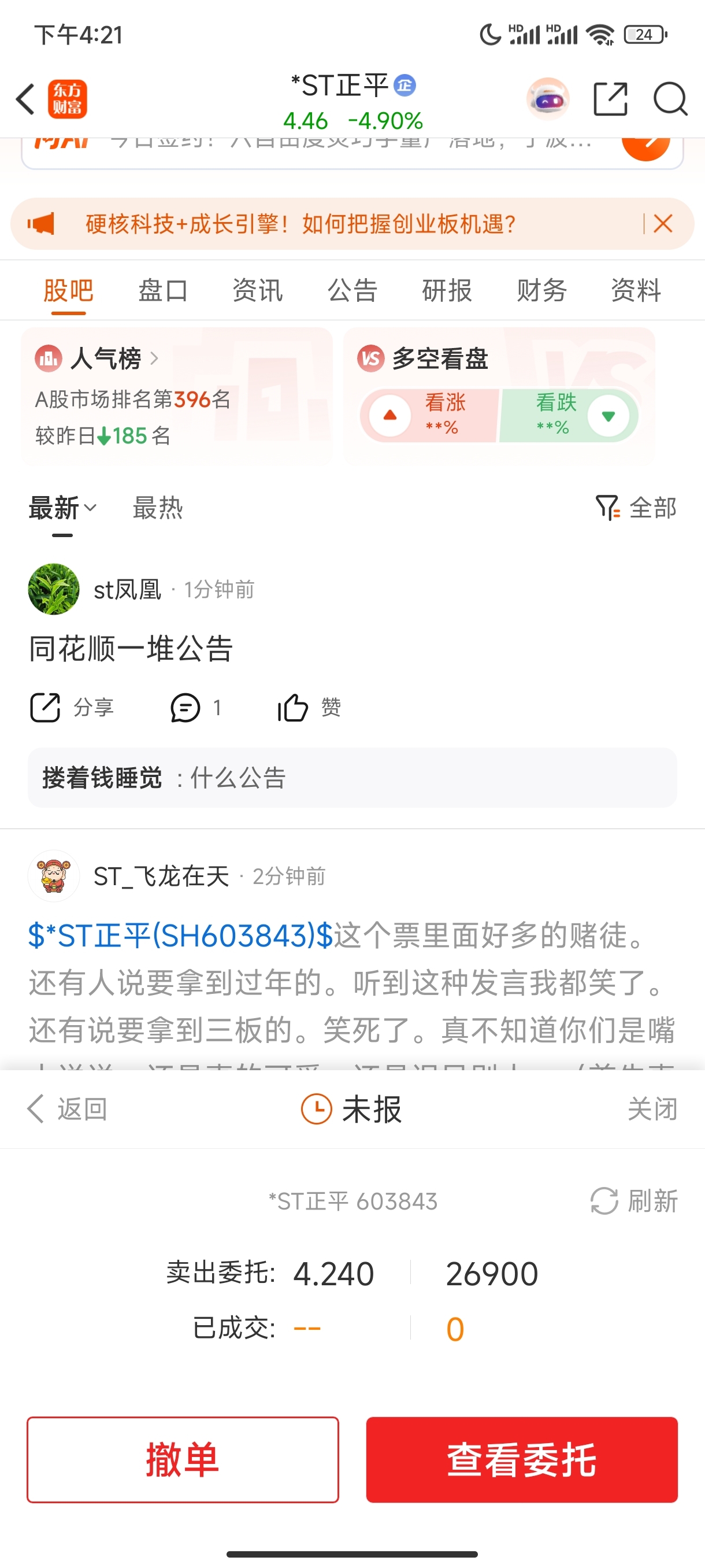 $*ST正平(SH603843)$ 一群赌徒在这里,我害怕,今天就应该卖的。信了一些人的鬼话,让我忍住了一下。明天走了,再见。