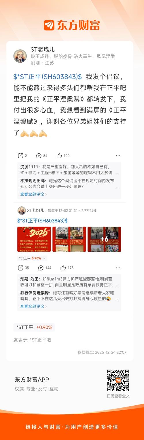 $*ST正平(SH603843)$ 我发个倡议,能不能熬过来得多头们都帮我在正平吧里把我的《正平涅槃赋》都转发下,我付出很多心血,我想看到满屏的《正平涅槃赋》,谢谢各位兄弟姐妹们的支持了
