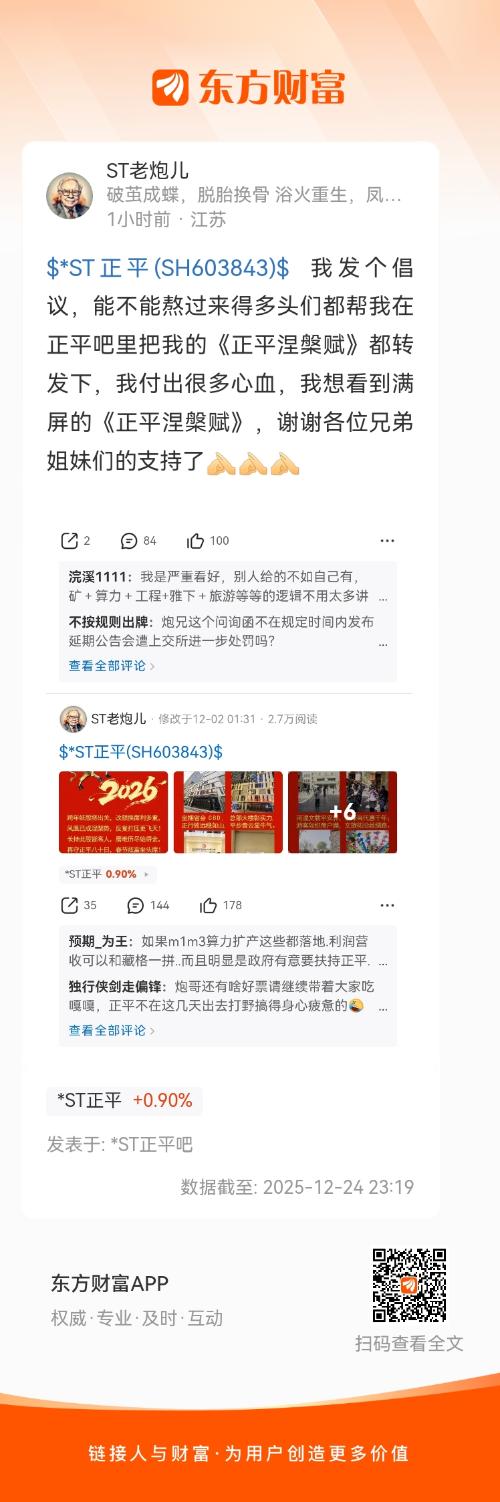 $*ST正平(SH603843)$ 我发个倡议,能不能熬过来得多头们都帮我在正平吧里把我的《正平涅槃赋》都转发下,我付出很多心血,我想看到满屏的《正平涅槃赋》,谢谢各位兄弟姐妹们的支持了