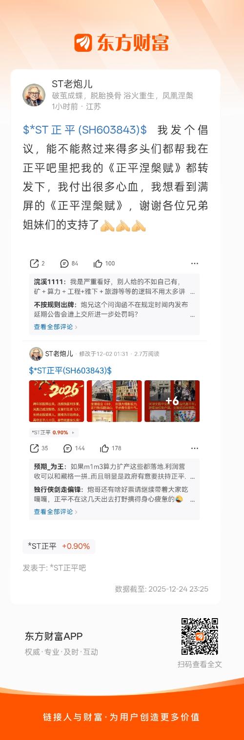 $*ST正平(SH603843)$ 我发个倡议,能不能熬过来得多头们都帮我在正平吧里把我的《正平涅槃赋》都转发下,我付出很多心血,我想看到满屏的《正平涅槃赋》,谢谢各位兄弟姐妹们的支持了