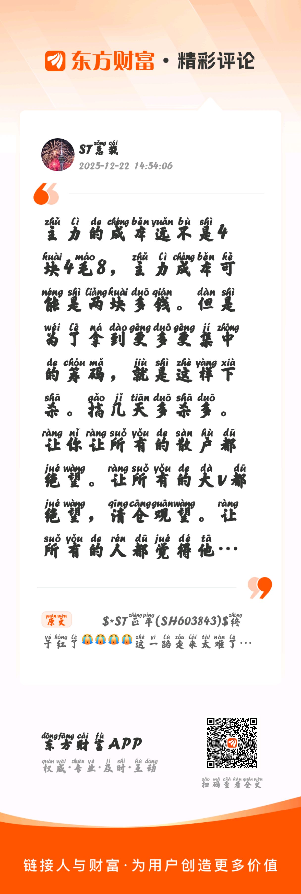 温馨提示: 1.根据《证券法》规定,禁止编造、传播虚假信息或者误导性信息,扰乱证券市场;2.用户在本社区发表的所有资料、言论等仅代表个人观点,与本网站立场无关,不对您构成任何投资建议。用户应基于自己的独立判断,自行决定证券投资并承担相应风险。《东方财富社区管理规定》