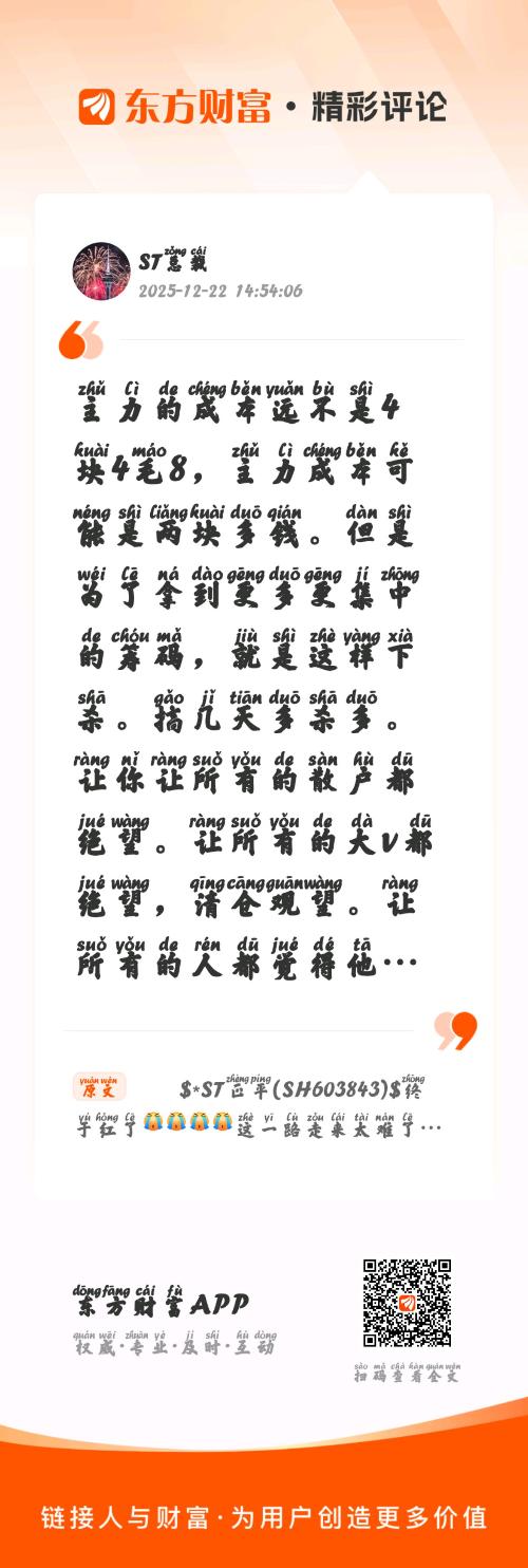 //@ST总裁 :主力的成本远不是4块4毛8,主力成本可能是两块多钱。但是为了拿到更多更集中的筹码,就是这样下杀。搞几天多杀多。让你让所有的散户都绝望。让所有的大v都绝望,清仓观望。让所有的人都觉得他之前的逻辑是错的。然后再往上拉。然后之前所有人做空的人又会成为做多的人。重新相信自己的逻辑。