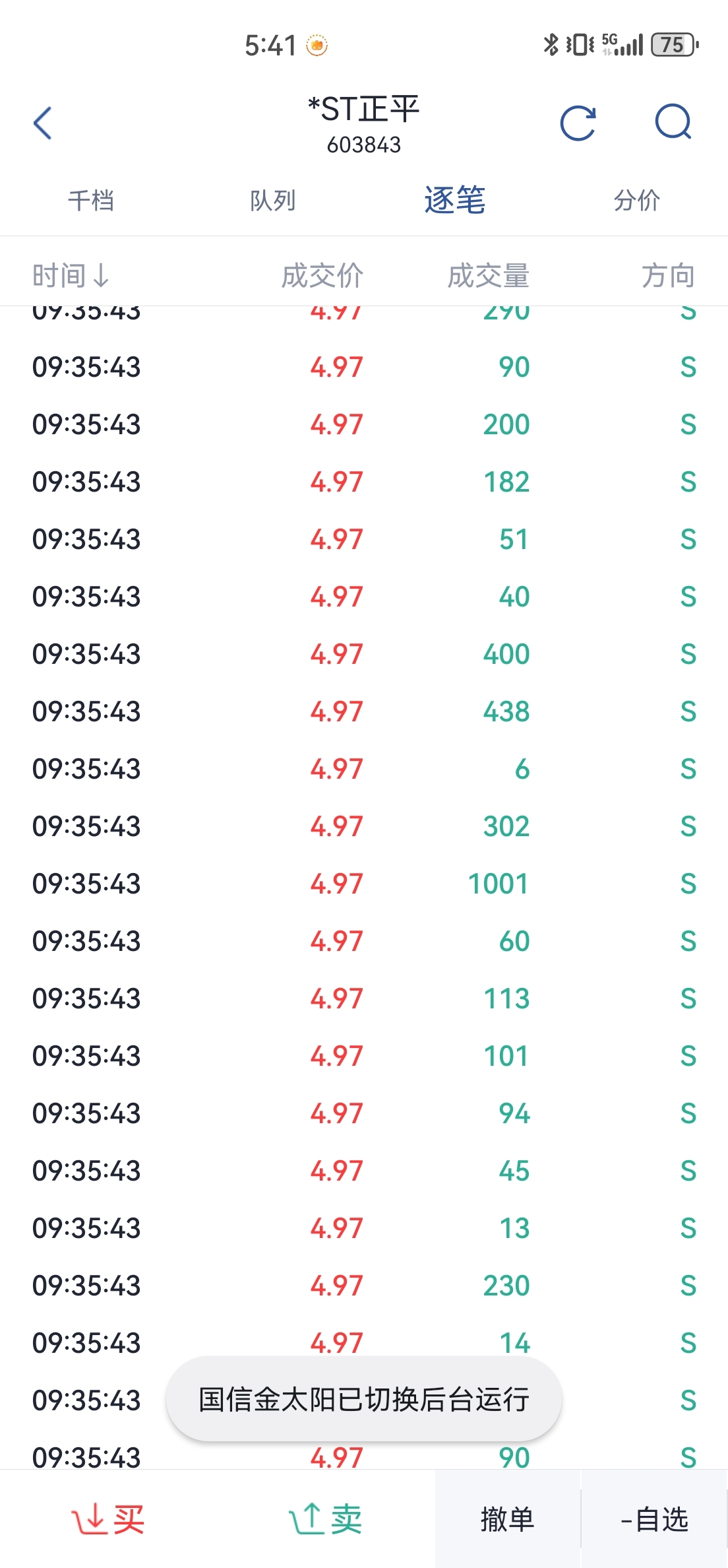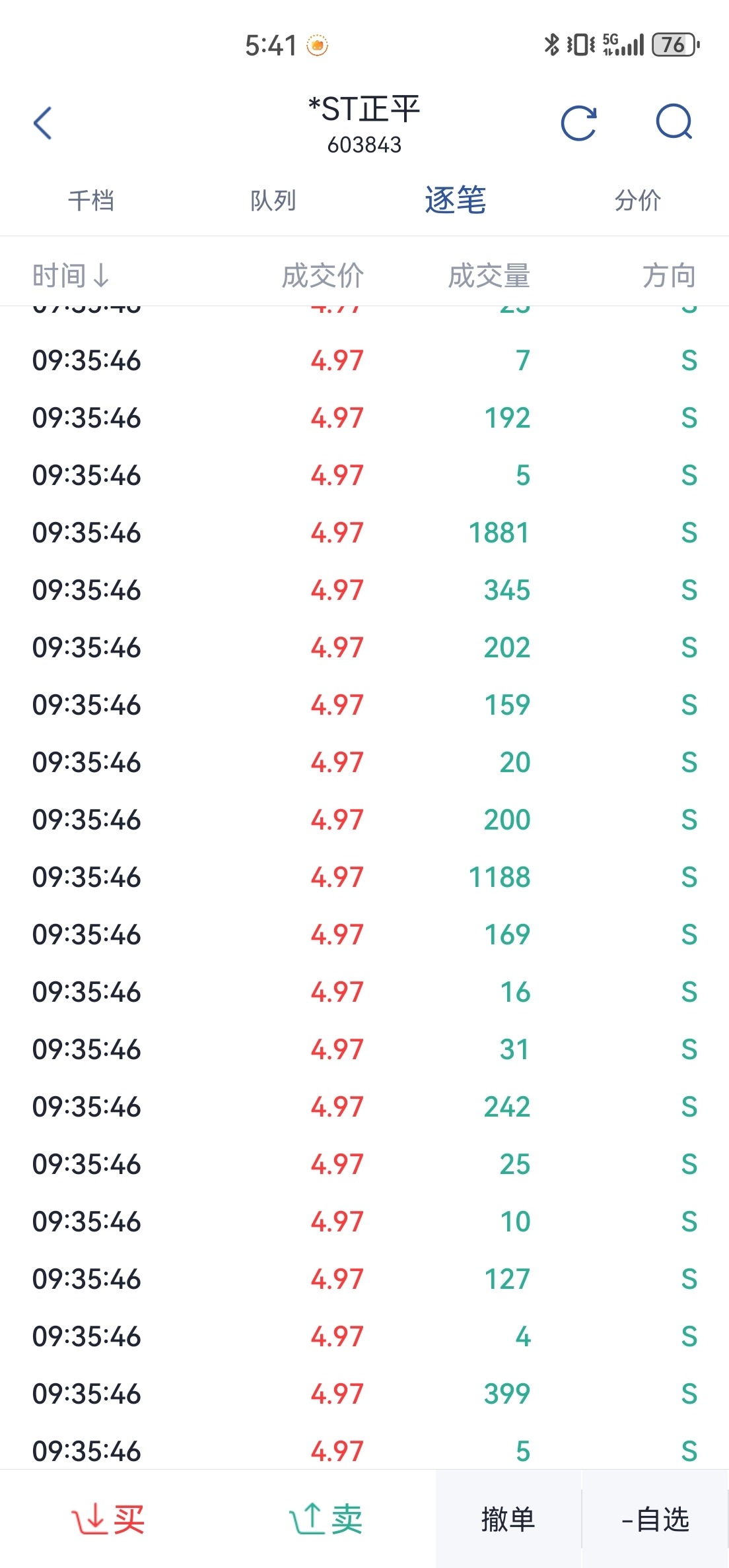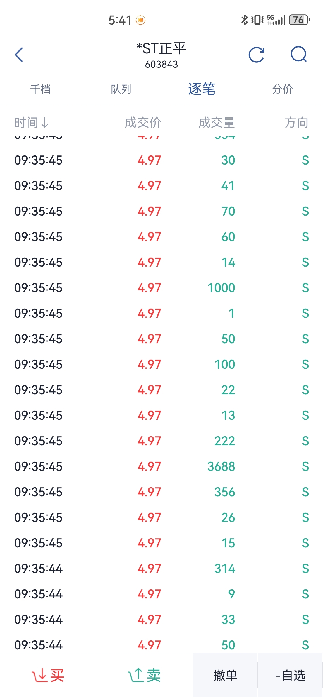 统计了今天千手以上的卖出单,根本就没有多少卖出的就是主力带动骗散户交出筹码,千手单卖出平均1700,但是千手买入平均2900,超大单买入都是卖出的快一倍了,卖出的签手单最高就一个3000多,但是买入的好几个4000多手和3000多手,主力是出逃还是收集筹码一目了然,连个L2都开不起的小丑,还在这说主力出逃我都想笑$*ST正平(SH603843)$