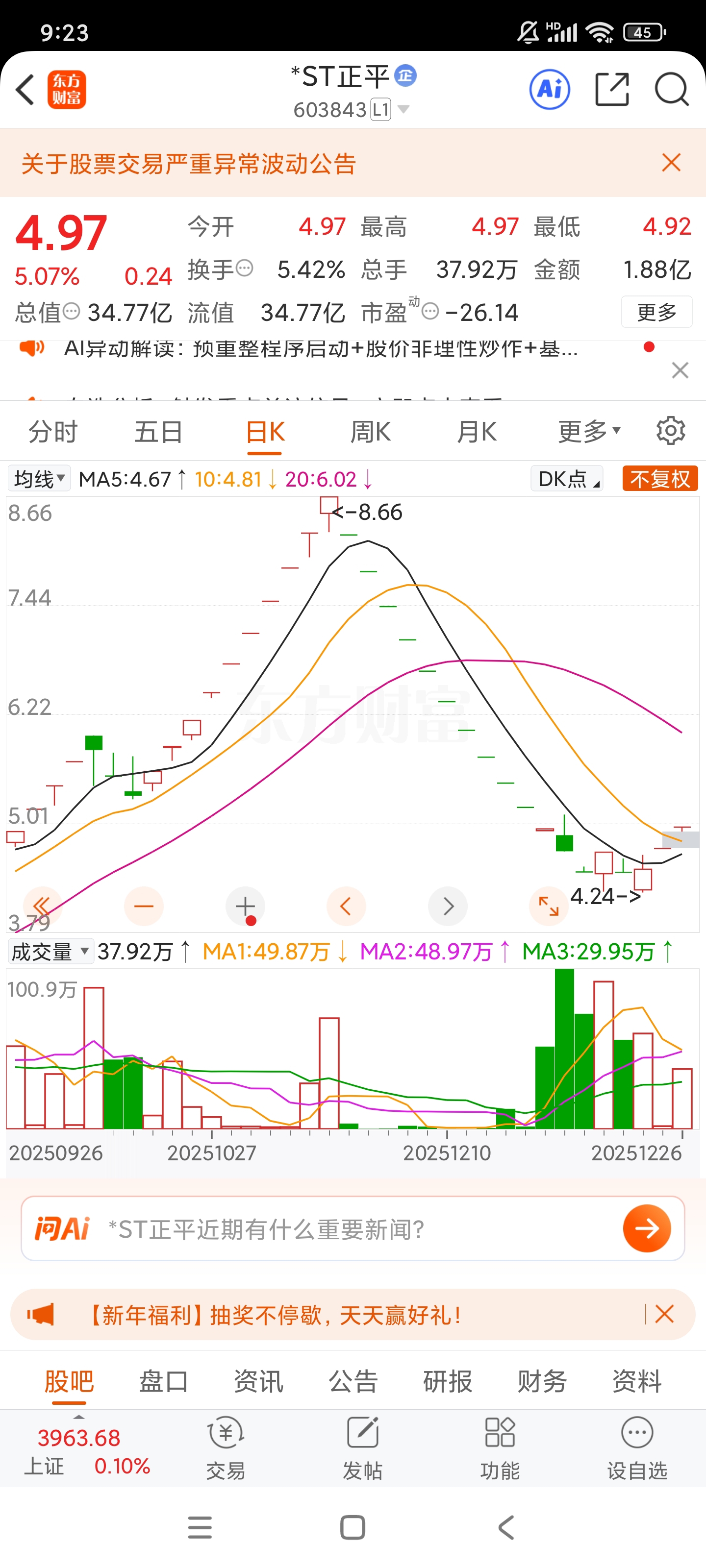 $*ST正平(SH603843)$ 5板左右,6元附近减仓获利了结。
