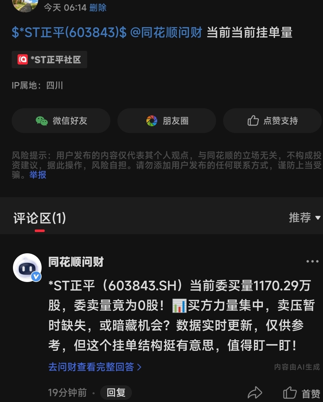 $*ST正平(SH603843)$ 破天荒了,昨晚挂买单,然后问了问挂单量,全部是买单,没有人卖一股,这……叫我怎么继续加