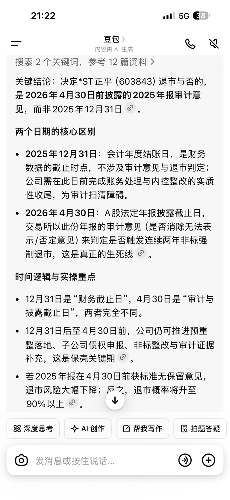 $*ST正平(SH603843)$ AI分析不一定对,但对政策理解绝对是大概率没问题。空苟使劲唱吧,你们卖了回不来难受是吧?那就继续难受吧!静态估值都不止现在的价格!风险在这,退市一线之间之际,就看人家重整投资人是啥态度了,现在这个阶段会赌博国有资产流失,赌博专业投顾团队折戟?人家团队没你个卖了唱空的小黑散专业?
