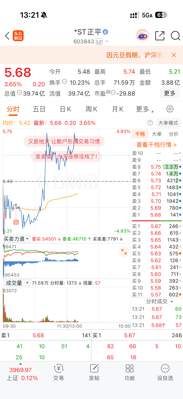$*ST正平(SH603843)$ 地板加一波,水下2.5个点再加一波