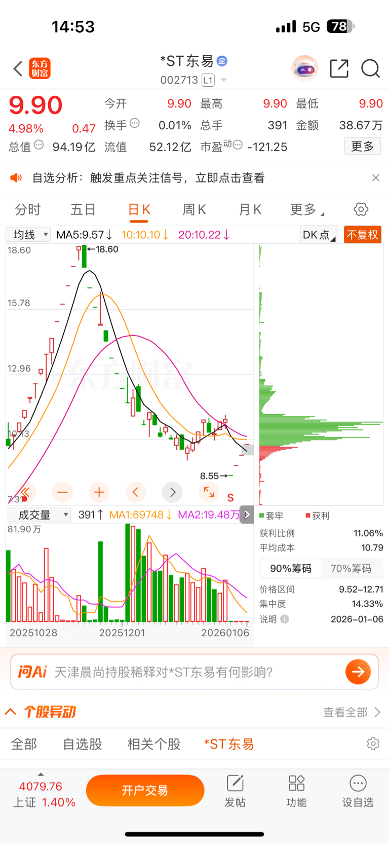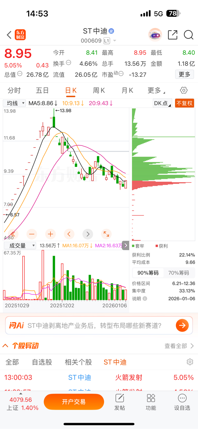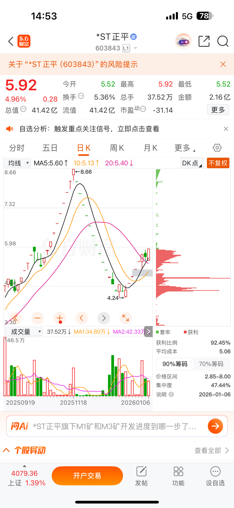 $*ST正平(SH603843)$ $ST中迪(SZ000609)$ $*ST东易(SZ002713)$ 以上三股对比,中迪和东易的筹码竟然都在股价上方,获利盘全都出清,也就是说这两股竟然都是套牢盘,相反,st正平底部筹码纹丝不动,12个跌停板下来竟然没卖?这么有信心吗?还是知情者坚持?