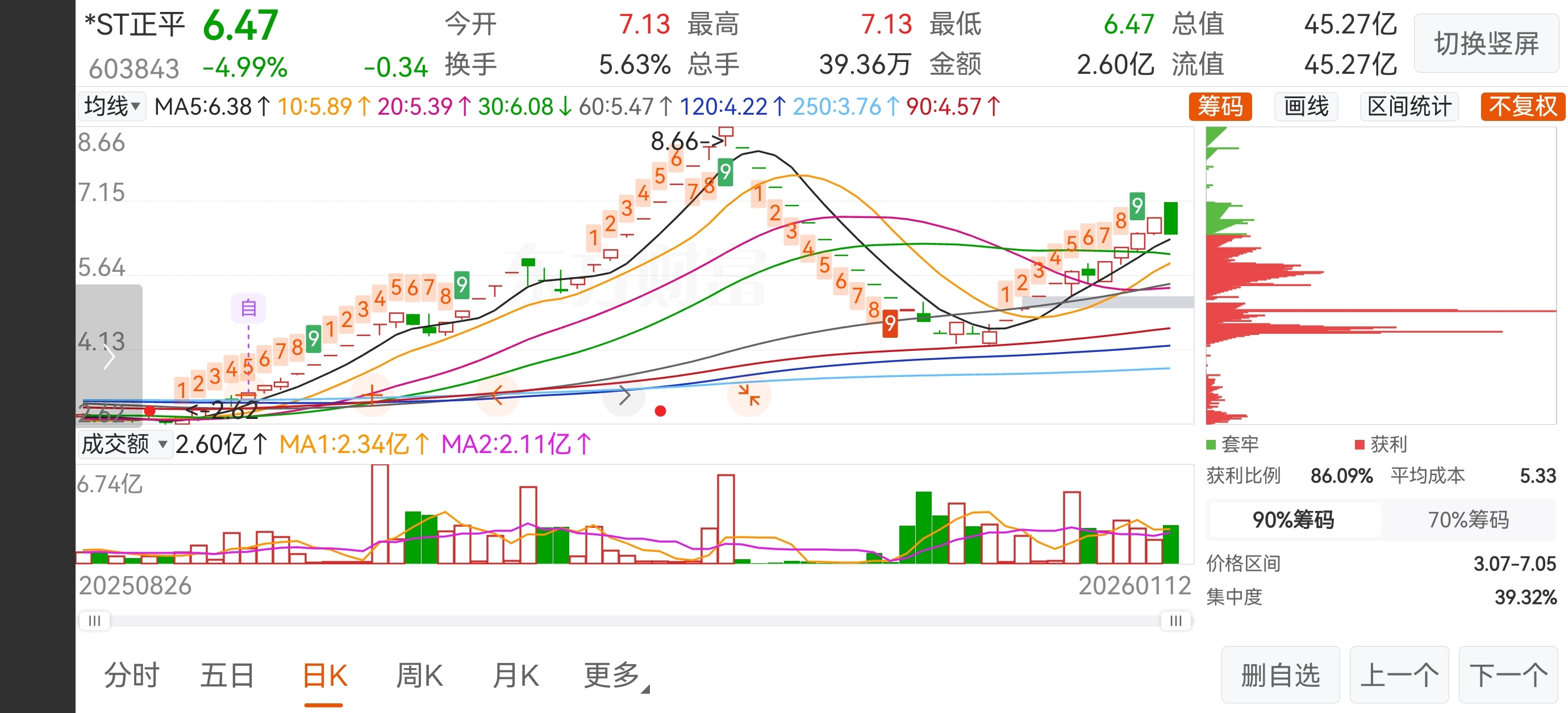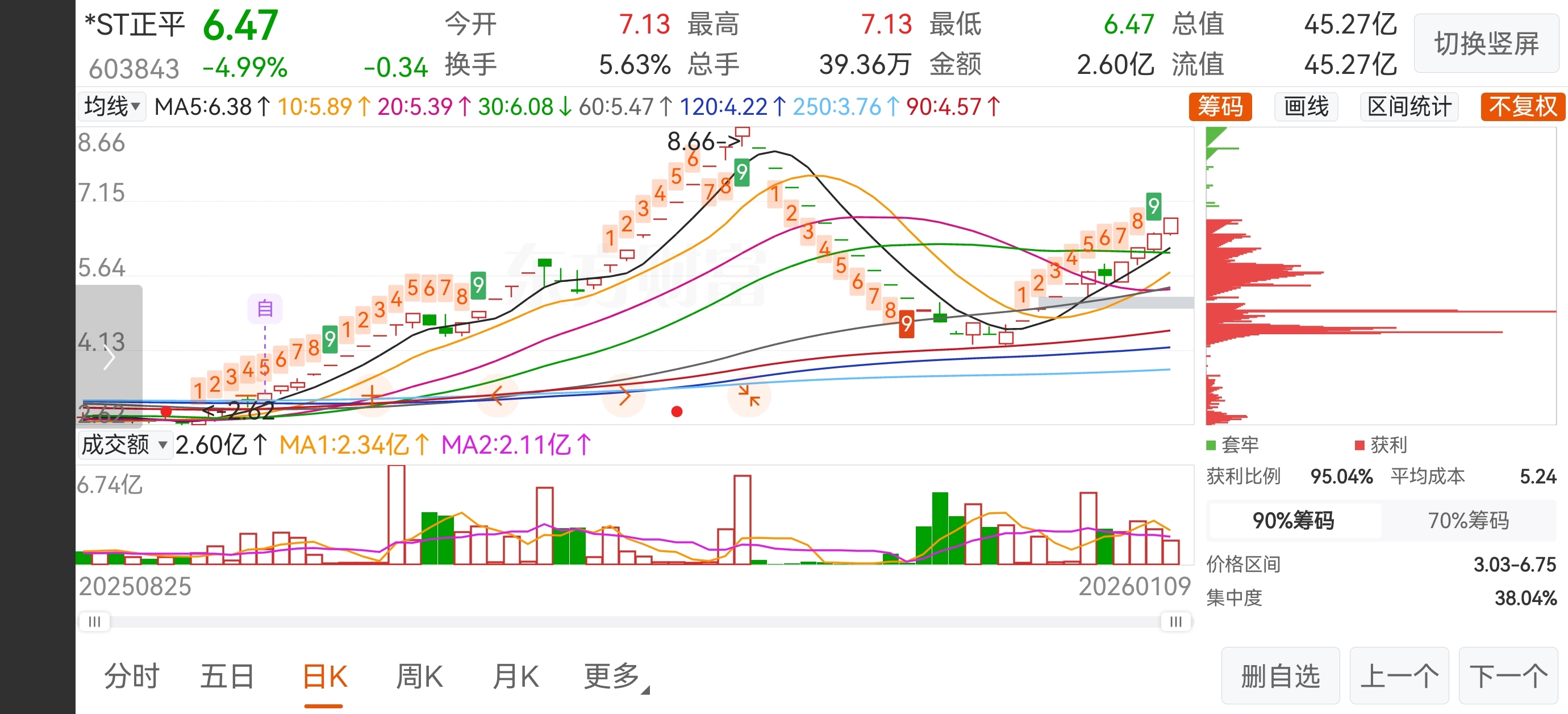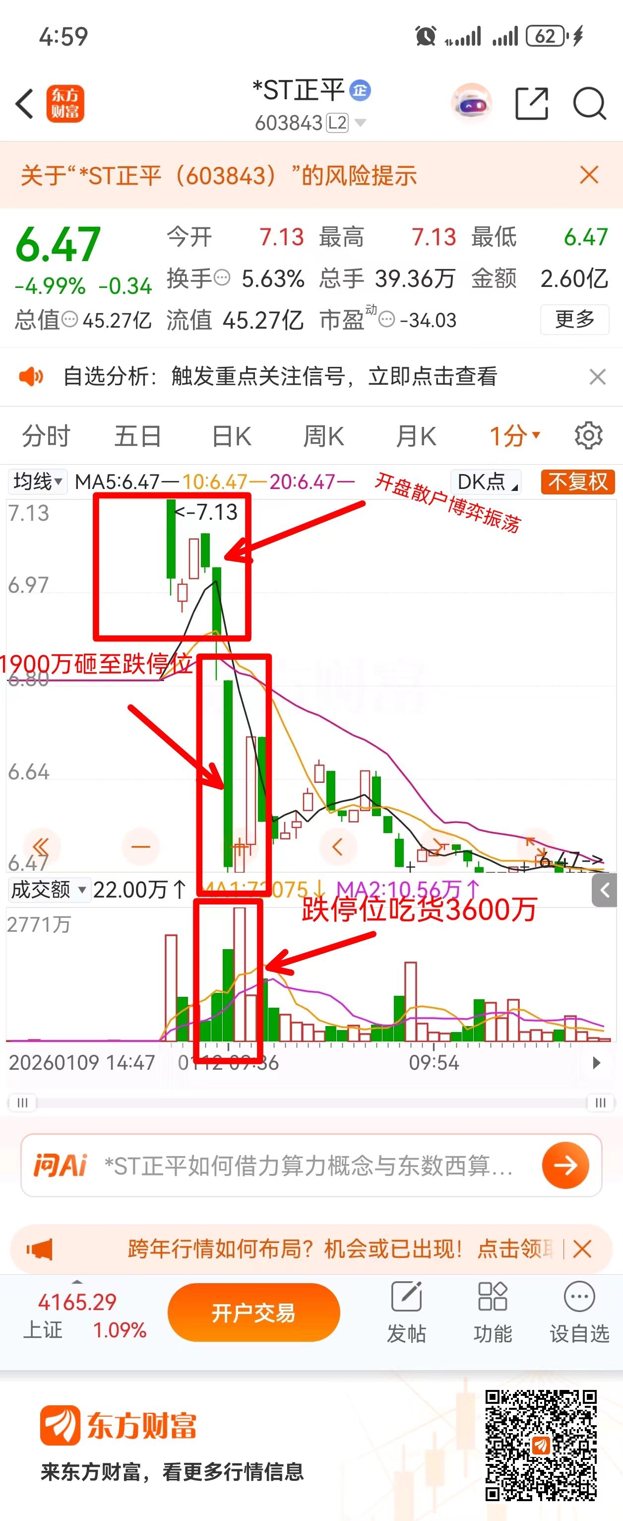 $*ST正平(SH603843)$ 今日正平开盘集合竞价由地板拉至涨停板(为何地价?那是总有人耍小聪明,挂地价可以抢跑,如果买单多可以撤单,用自己的主板思维来st板块进行实践,搞得st板块乌烟瘴气,之前正平关门杀就是因为有这群大聪明,我只能问候一下这群大聪明的家人,如果人人都是这种想法,st板块基本就废了,股性再好都能把他玩坏!),最终定价在7.13位置,开盘五分钟水上博弈,这是散户之间的博弈,由于最近获利盘较大,获利了结较多,所以空方取得了阶段性胜利,庄家眼见空方更胜一筹,于是庄家正好可以以控异动为由,又拱了一把火,直接挂单1900万空单压至跌停,但是庄家不可能为了控价丢失筹码,所以底部跌停价附近成交了3600万资金筹码,相当于庄家异动控了,筹码也吃了,何乐而不为?如果今天早盘是多方取得压倒性胜利,当然庄家肯定也会放弃控异动的想法,因为筹码难得,会和前几天走势一样,板上洗筹顺便小控异动价格。然后我们再来看一下筹码峰情况,以最长筹码定义为庄家筹码,周五和今天筹码峰基本未动,说明什么?说明庄家底部筹码基本已经锁仓,就更不可能有出货一说。庄家选择了锁仓观望,谁强就向着谁,那是因为还有很多预期没有出来,庄家的实力展示是后期主升浪阶段,现在还属于底部,让散户们互相博弈就够了,当然每一次主升浪前都有一次振幅较大的调整,以最后两图为例,都有两次天地板走势,然后就开始了他们的主升浪阶段,所以说启动前调整是有必要性的,可以洗掉短线客,获利盘,和不坚定资金,为后期主升浪阶段提前释放压力。正平的预期很大,后续公告也会比较密集,所以大家紧握手里筹码,不要轻易下车。咱们顶峰相见!