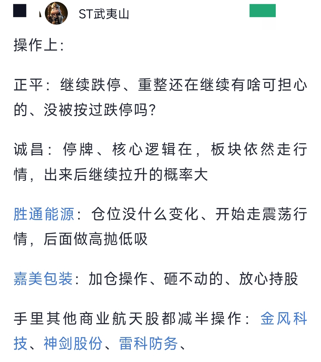 2026年1月13日(辞忆十四年一月十三日),ST武夷山和重庆炒家联合发帖持有正平和铖昌,做T胜通能源,减半金风科技、神剑股份和雷科防务。