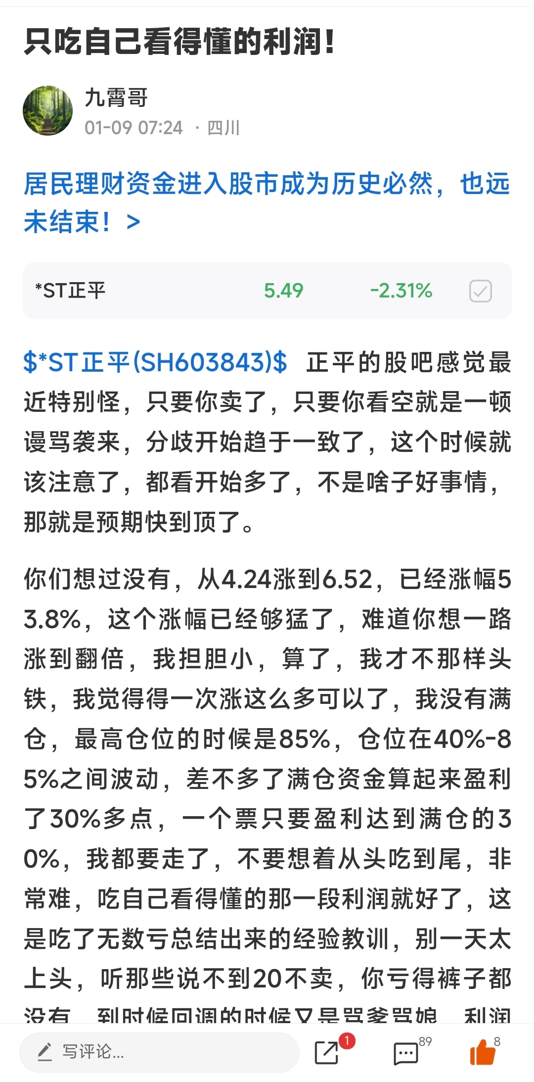 $*ST正平(SH603843)$ 现在再来看正平,你们才知道在1.9日提醒风险提醒卖出有多理智和清晰,当时追着我骂,把我拉黑,我把骂人拉黑的也很多,现在事实胜于雄辩!