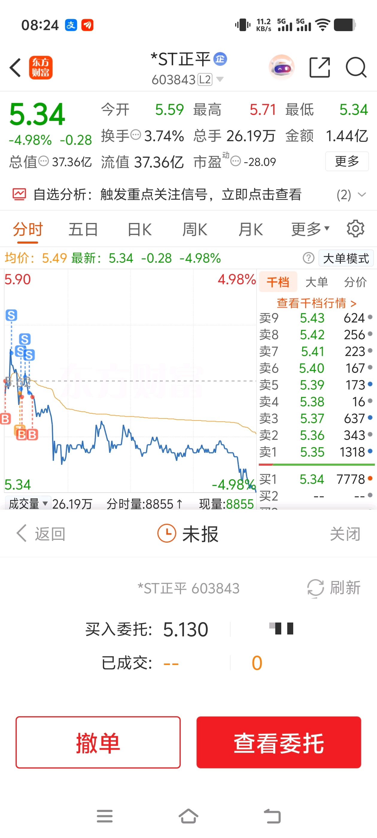 $*ST正平(SH603843)$ 请给我个跌停,谢谢!