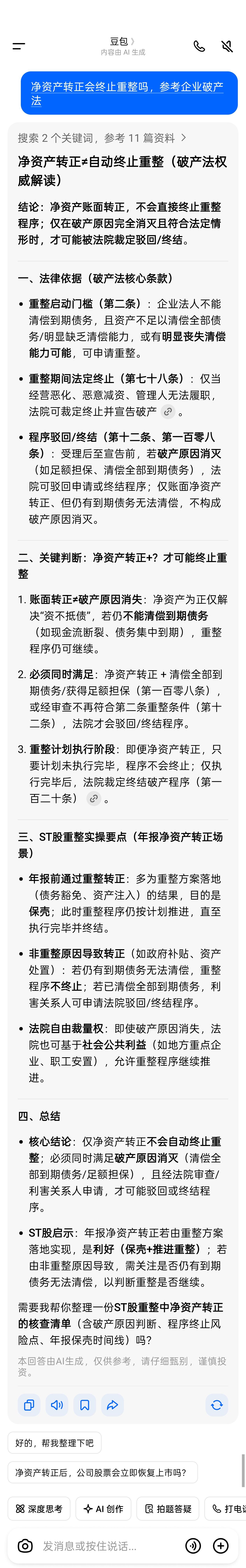 看到很多人说净资产为正就终止重整,那图上也没明确的说啊,这是我问ai的