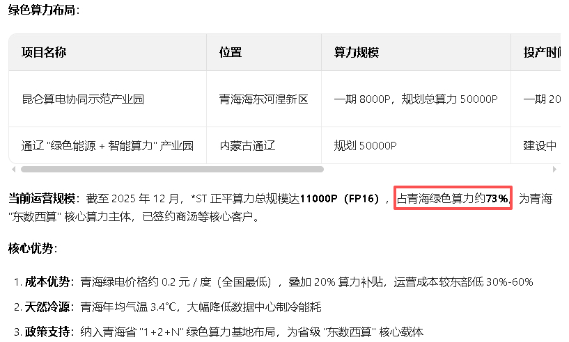 $*ST正平(SH603843)$ 针对于青海国投于2025.12.31发布的企业战略关键词解读1绿色算力为发展目标:当前青海拥有绿色算力直接产业的本土上市公司为正平,且总规划为11000p,占青海绿色算力约73%,2025年八月份8000p已建设完满租状态。2控股一家上市公司:经过某查了解到青海国投目前旗下没有控股的上市公司,那么它会选择入主哪家公司呢;我们先来了解下青海有哪些本土的上市公司盐湖股份(钾肥产业,国资委控股)、藏格矿业(锂钾产业、上杭县财政局)、西部矿业(多金属资源产业、青海国资委控股)、西宁特钢(特钢产业、青海国资委控股)、天佑德酒(酒业、私营)、st正平(基建、绿色算力、矿产资源、私营)、金瑞矿业(化工产业、青海投资集团控股)、ST春天(中药材、白酒产业、私营)、st海华(服装产业、私营);一共九家本土上市公司,拥有绿色算力的只有正平!而且那几个矿产巨头早已国资控股,难道会选择后面这几个做服装、中药材、白酒的?这也不符合青海国投的发展战略;所以青海国投入主正平是必然,已经很明了,绿色算力+矿产资源双轮驱动!预重整又指定头部律师所金杜,后面怕那几个涉及非标问题的子公司耽误重整进度不把它们归纳进来,但是后面又把非标问题的主要子公司贵州水利加了进来,种种这些,都反映了事态再往好的方向发展,不管退不退市,这团乱麻一定要解开,这些毒瘤一定要挖除,长痛不如短痛!上个星期我有个后槽牙肿痛,这颗牙齿每年都会反复发炎,痛不欲生,我实在痛的受不了去了医院,医生说要做根管治疗,就是把针打在你牙齿上,那痛苦一绝,还不算完,还要往你牙齿上钻孔把牙齿内的腐烂物质挖除,有多痛只有做过的才知道;做之前我问医生可以不做吗,吃点消炎药,她说可是可以,但是你牙齿里面都烂掉了,以后还会发炎,腐烂到深处更严重到时只能拔了!后来我忍着痛做了根管治疗,还带了个牙套巩固,现在我这颗牙齿非常好坚硬,早知道早做了,不至于每年反复发作痛苦;正平也一样,只有金杜这个专业的医生来找出问题,解决问题才能让正平活下去,才能让干干净净的正平交到国资手里做大做强!由资源大省向科技新兴产业转型!