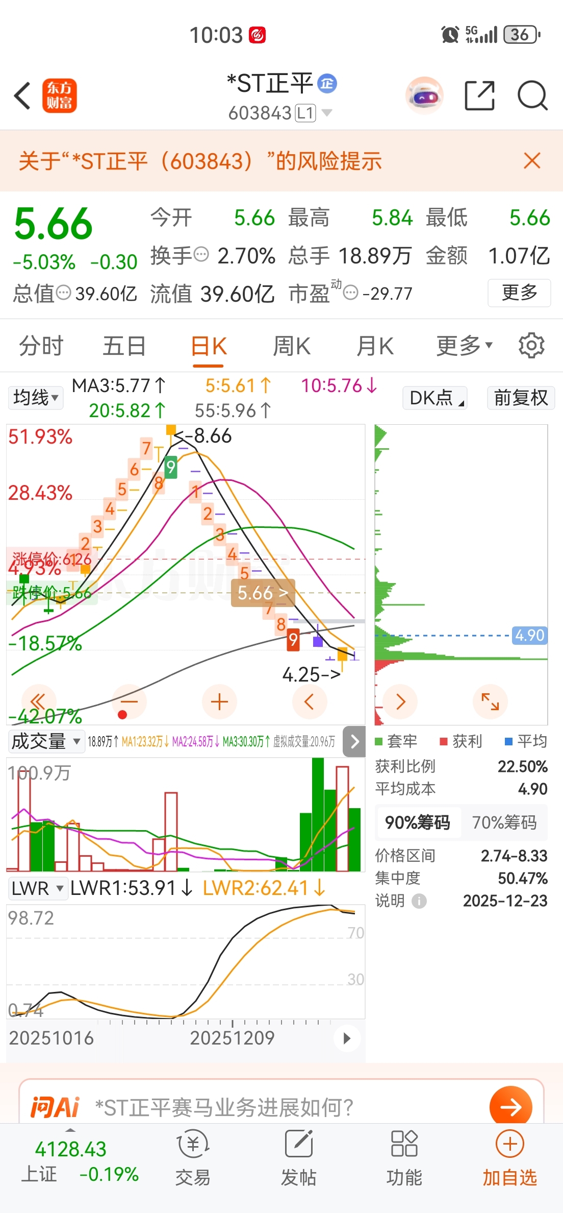 $*ST正平(SH603843)$ 这个有点搞笑哈,一字上去一字下来