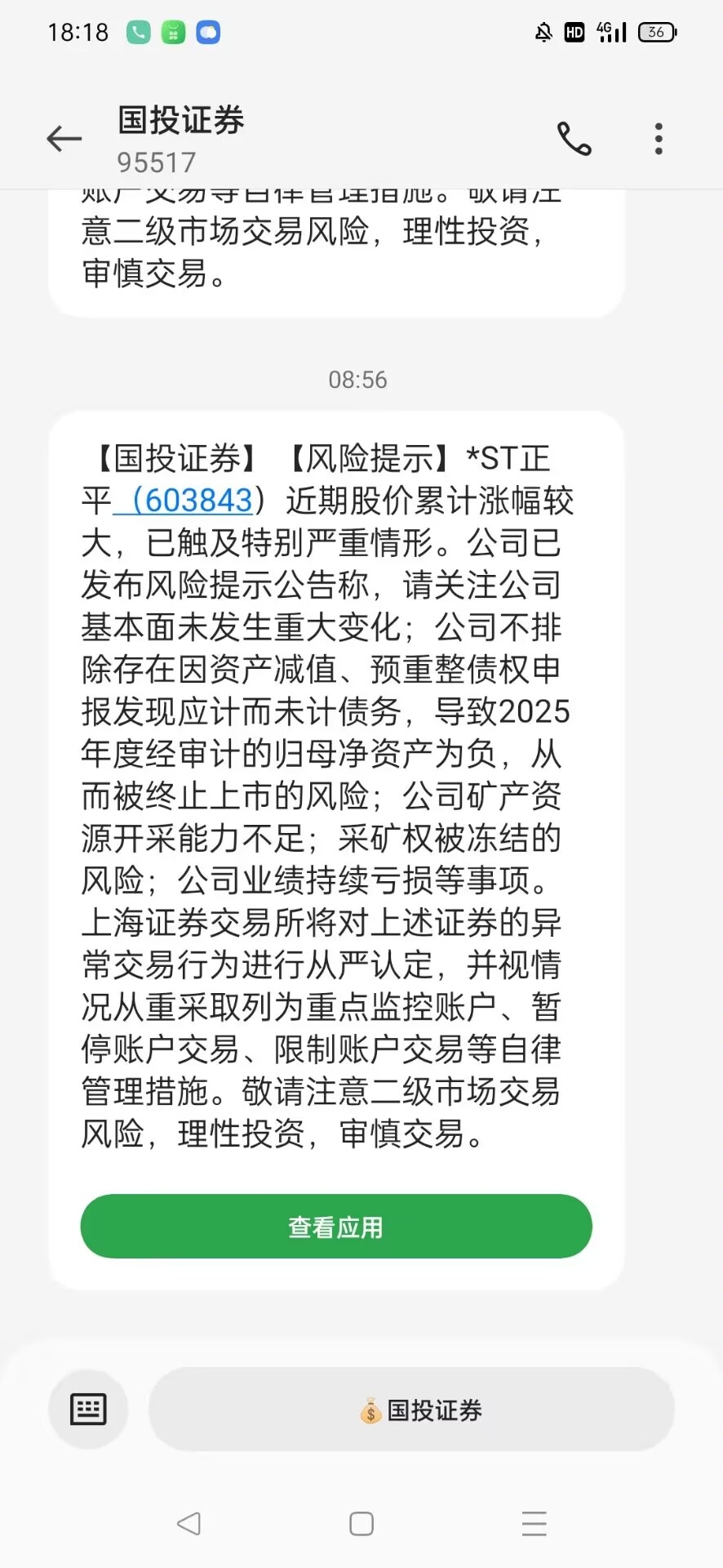 $*ST正平(SH603843)$ 我早上也收到这种短信,说正平近期涨幅过大,