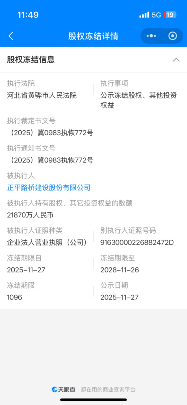 第一张图是我在天眼查找到的金九金冻结股权的信息,冻结时间2025-11-27起;