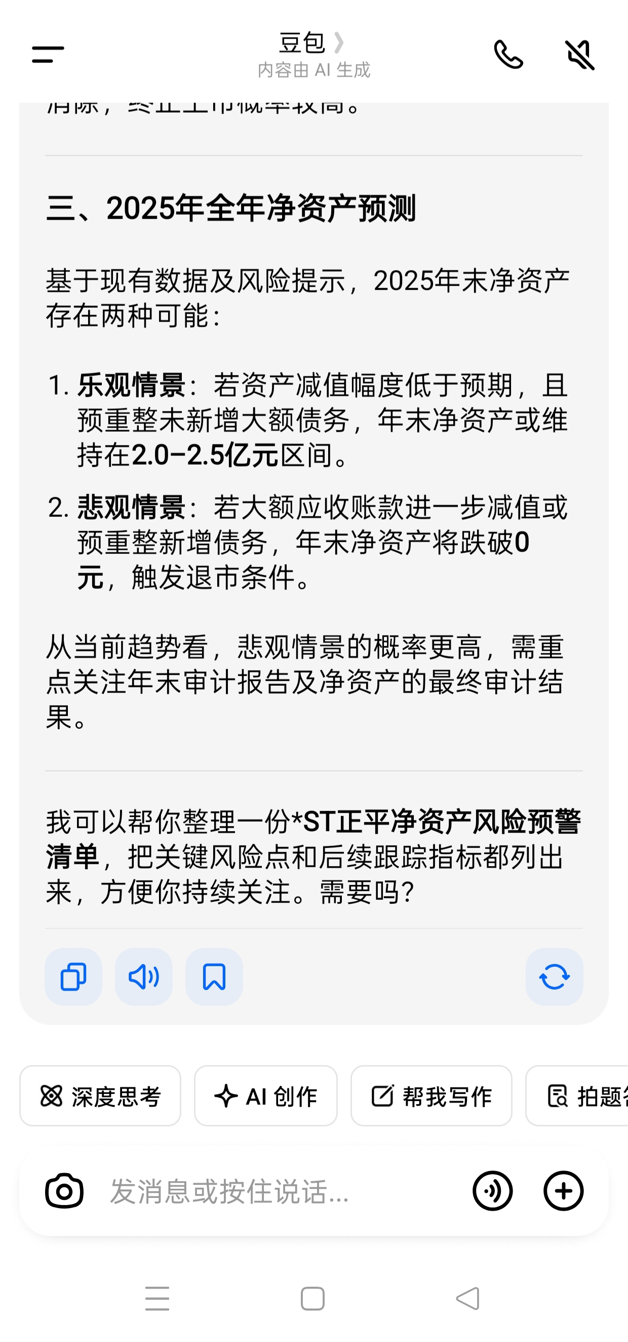 按照正平2024年年报及上面的2025年半年报等上市公司的公开资料,让豆包分析的正平2025年全年的净资产情况如图。其中,应收账款还给正平多少是政府说了算,如果政府不想让正平退市,就肯定会还款度过退市难关。另一个影响净资产的就是债务申报是否发现了新的债务及其数额。昨天有人打公司电话了,不知道公司是否提了这一块。