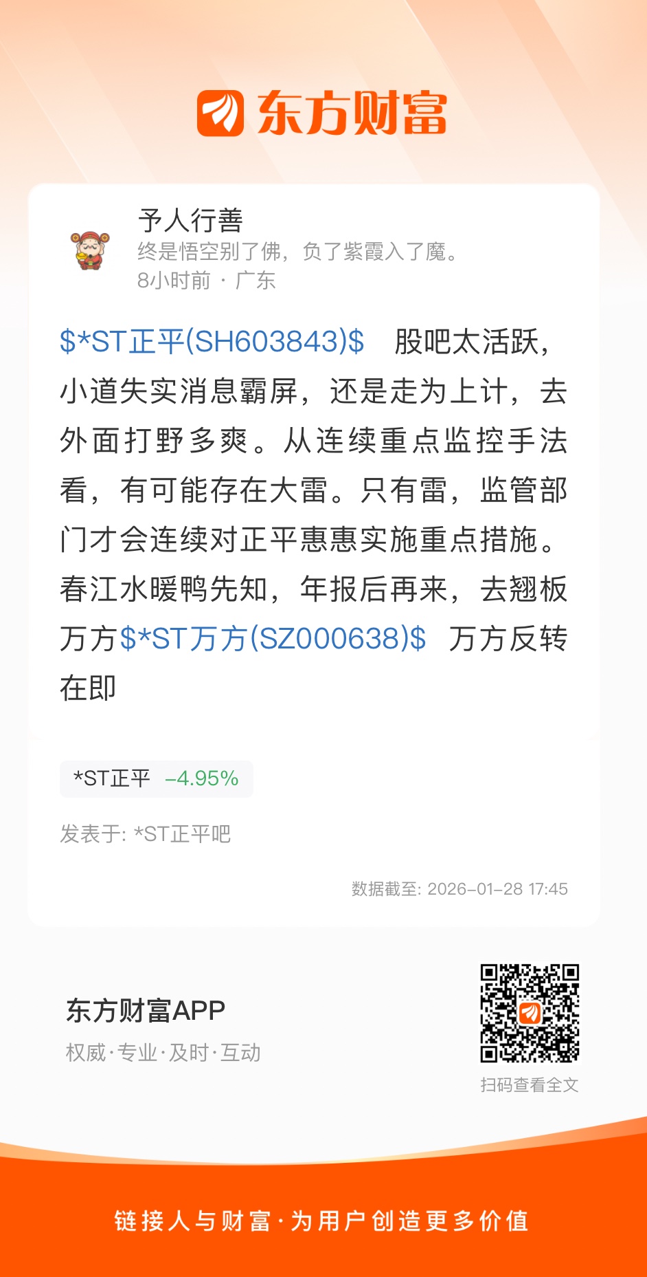 $*ST正平(SH603843)$ 股吧太活跃,小道失实消息霸屏,还是走为上计,去外面打野多爽。从连续重点监控手法看,有可能存在大雷。只有雷,监管部门才会连续对正平惠惠实施重点措施。春江水暖鸭先知,年报后再来,去翘板万方$*ST万方(SZ000638)$ 万方反转在即