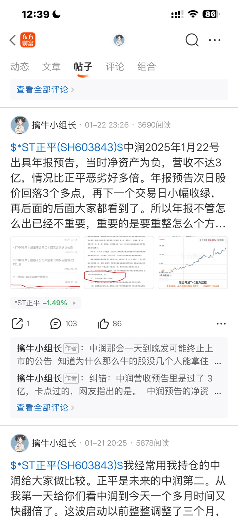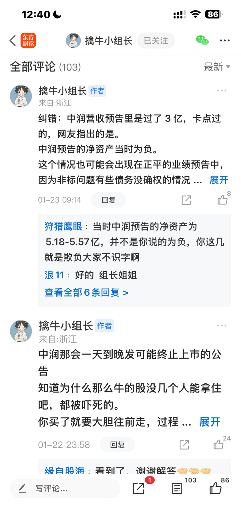 擒牛小组长1月22日发帖说当时的st中润业绩预告净资产为负,竟然有那么多散户相信