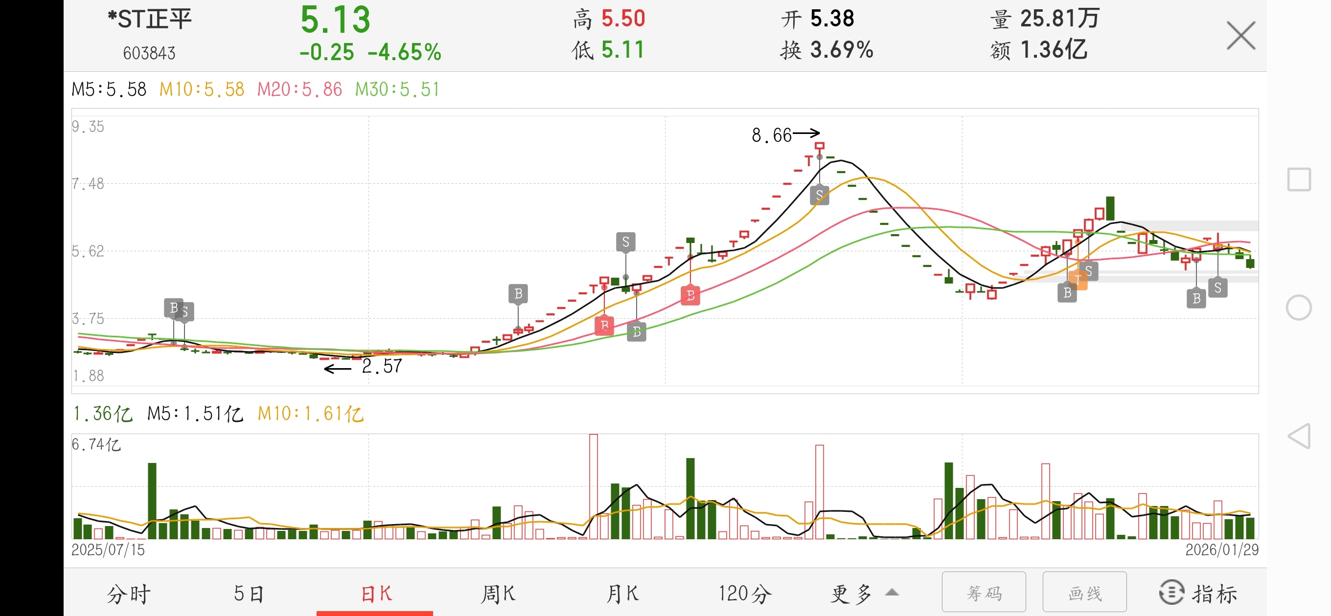 $*ST正平(SH603843)$ 逃顶我是专业的,这票没有连板,就得往下走,今天有人接手,按我分析,想在5.16博支撑,结果没支撑住,还得继续调整,等4.26左右再看,支撑强弱