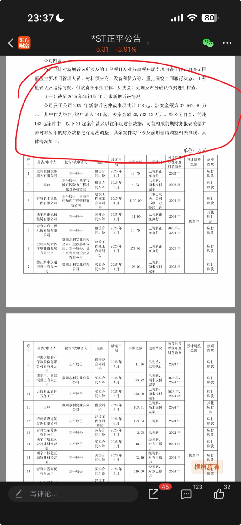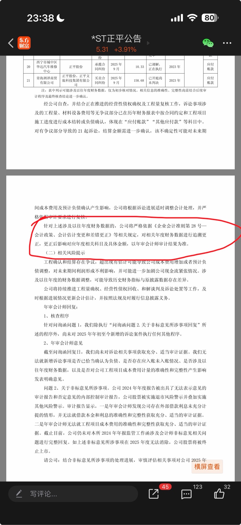 最关键的一个,就是我截图的这个。21起新增诉讼涉及以往年度财务数据,“可能构成前期财务报表差错并需对对应年的财务数据进行追溯调整”