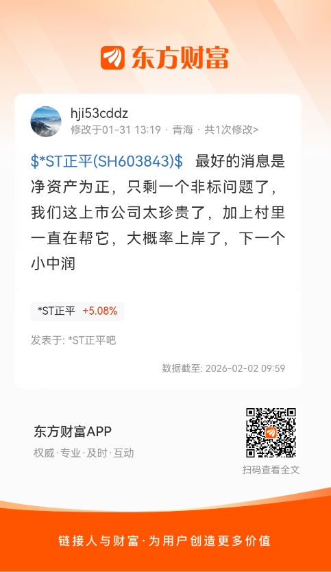 $*ST正平(SH603843)$ 最好的消息是净资产为正,只剩一个非标问题了,我们这上市公司太珍贵了,加上村里一直在帮它,大概率上岸了,下一个小中润