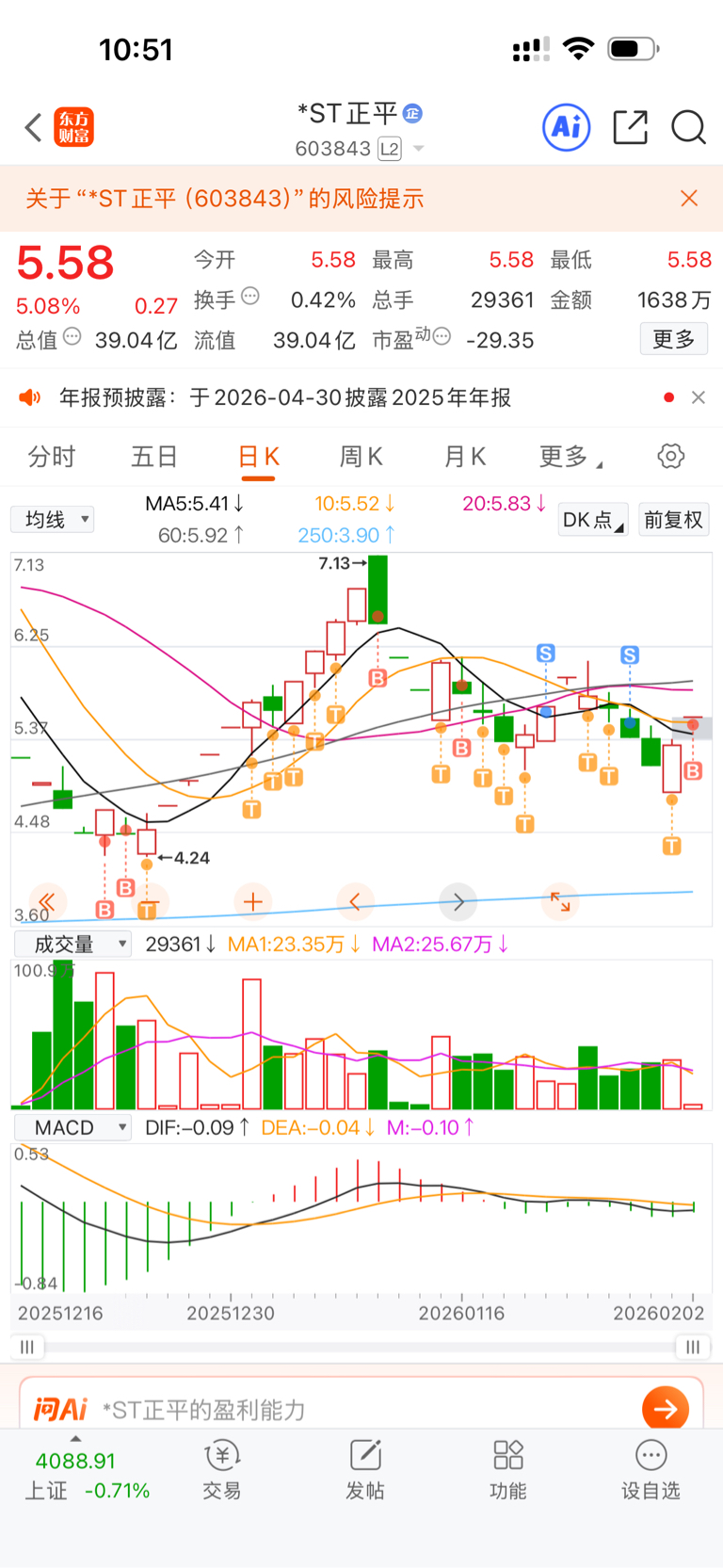 $*ST正平(SH603843)$ 赶快顶板 主力使坏砸盘 还有买进的可能 起码5个板,因为缩量10倍,顶进去还有大肉,外面大盘不好 st会有资金追