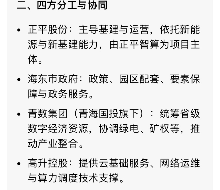 $*ST正平(SH603843)$ 借用正平的新年贺词“拨开迷雾,走出困局”,搜集了一些官方信息,整理下思绪,正平大概率青海国投(青海省国有资产投资管理有限公司)入主,因为目前青海只有正平符合青海国投的发展战略;先来说正平与青海国投的关系,昆仑算电协同示范产业园由正平、海东政府、青数集团、高升控股合作建设(图1),而正平为运营主体,产业园也是由正平旧厂房改造而来,四方分工与协同(图2);赋能正平算力产业的青数集团100%控股股东为青海国投(图3),也就是说青海国投早已切入正平,而青海目前这9个上市公司只有正平正式投产绿色算力,这也是符合青海国投2025.12.30发布的发展战略“重点布局清洁能源、矿产资源等等,控股一家上市公司”(图4)不懂也可以看看我昨天发的帖子;再来说说前不久预重整新增的一系列诉讼公告,目前来看正平最大的债权人是青海银行,重点来了,青海银行跟正平什么关系?他们什么关系不重要,但青海国投之前一直是青海银行的第一大股东实控人!青海国投于2023年8月份左右无偿划转青海银行所有股份给青海财政厅,青海银行第一大股东由青海国投变更为青海财政厅(图5),原来搞来搞去还是这一帮子人,那些诉讼不过是确权而已,而1.09的股权冻结公告(图6)也不过是对自有权益进行锁定保护,后续可能会直接司法划转给青海国投,现在实控人与一致行动人股权与m1、m3的探矿权采矿权均被冻结,这属于是锁定权益,为战投进场做准备,让战投没有顾忌;最后总结了一下关系图(图7),对错留给时间吧,我也不过是收集信息,都是官方信息可查,并非个人臆想,为坚守在正平的兄弟姐妹打气!